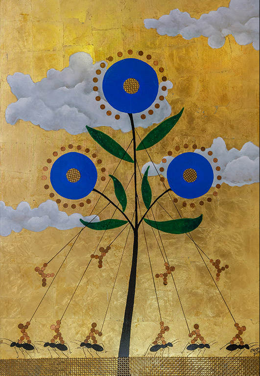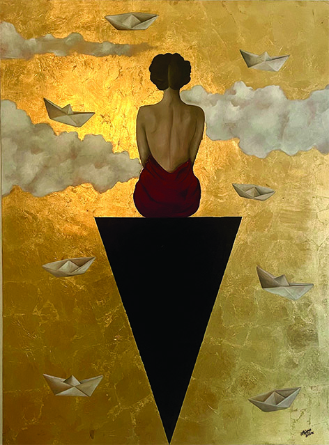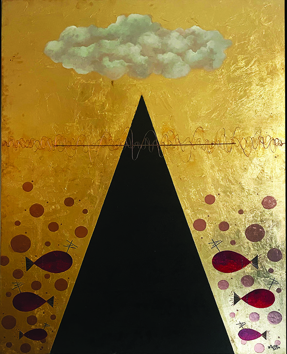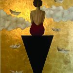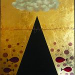 Nell’itinerario alchemico la nigredo rappresenta il primo stadio trasformativo della materia verso l’aurum philosophorum. Il simbolismo allegorico, di cui questa tradizione esoterica è intrisa, allude al processo di evoluzione psicologica innescato dal contatto con la natura più profonda di sé. Come le fasi di un’opera alchemica, le composizioni pittoriche di Lo Russo rappresentano, fra ombre e bagliori lucenti, le tappe di un cammino di individuazione creativa. In un equilibrio estetizzante di forme e colori, che evoca atmosfere sospese di stampo metafisico, la produzione dell’artista accosta alla carica pulsionale del nero la forza trascendente e contemplativa dell’oro. L’ampio utilizzo di quest’ultimo, unitamente al suo indubbio valore iconografico, dilata la dimensione onirica dei dipinti, sino a diventarne la cifra stilistica peculiare. La pittrice vive l’arte come un rifugio, un luogo iniziatico di autoconoscenza, mediante cui rischiarare porzioni poco illuminate di sé. Con un linguaggio espressivo spontaneo, che non esita a includere materiali extra-pittorici come sabbia, reti e centesimi, lo sguardo sognante dell’artista rincorre visioni giocose, impregnate da reminiscenze nostalgiche. La nuvola, protagonista e soggetto ricorrente nelle rappresentazioni dell’artista, ricorda l’inesauribile mutevolezza dell’essere.