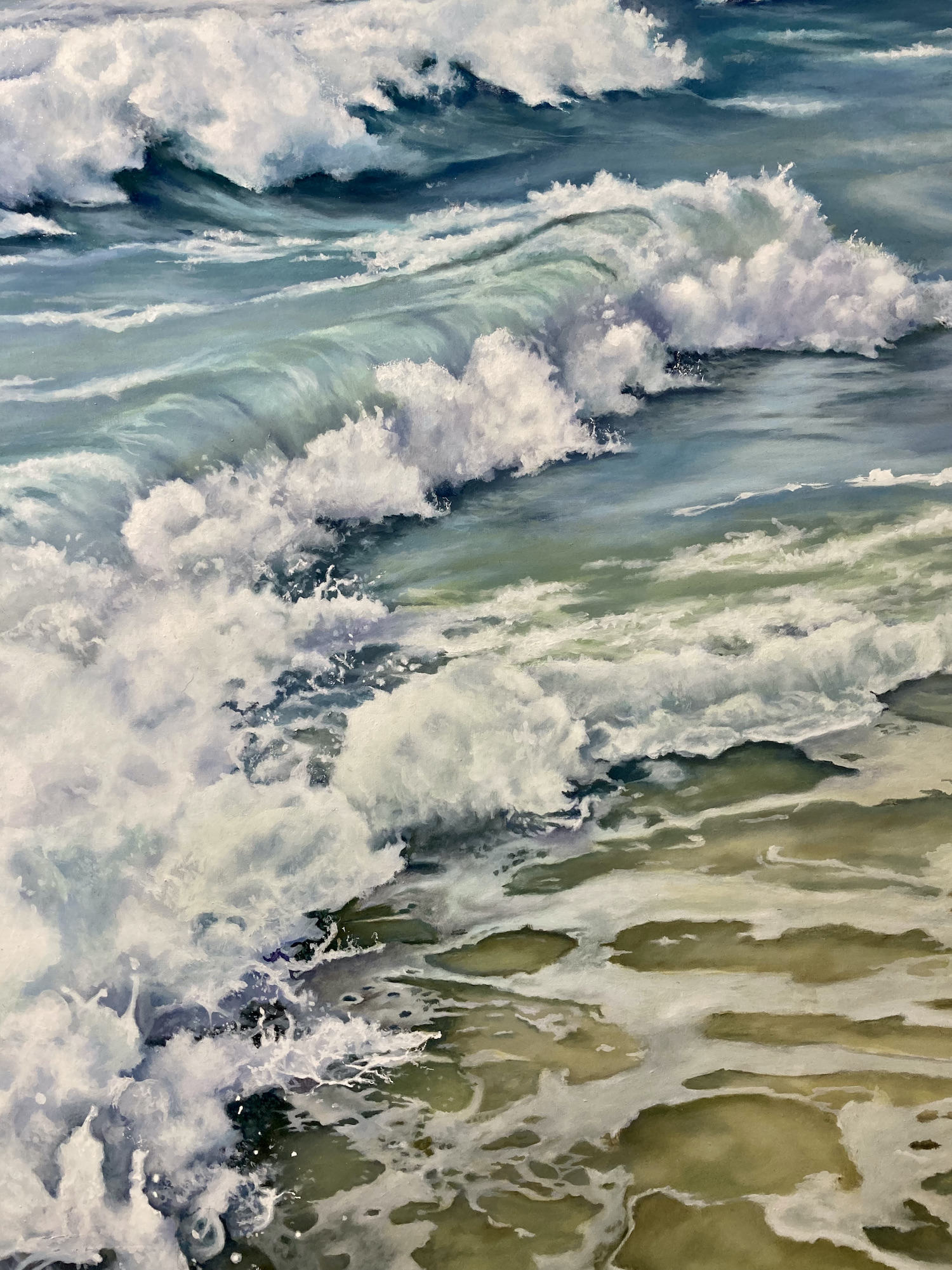 Colori a olio su tela e a pastello su carta, queste le tecniche utilizzate con maestria da Lucia Onesti per raccontare le sue onde, inquadrandole all’interno di altre inquadrature, come chi il mare lo vive da vicino e lo ama profondamente.