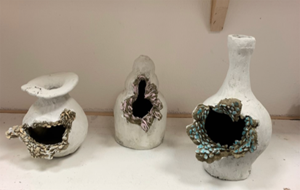 Nature and in particular flowers represent the fragility of beauty and the ability to flourish under adversity. I admire how complicated and beautiful flowers are, along with their strength and the patterns that they create in the wilderness. I am also interested in women’s bodies, using both the female and floral forms as vessels made of clay in my work.