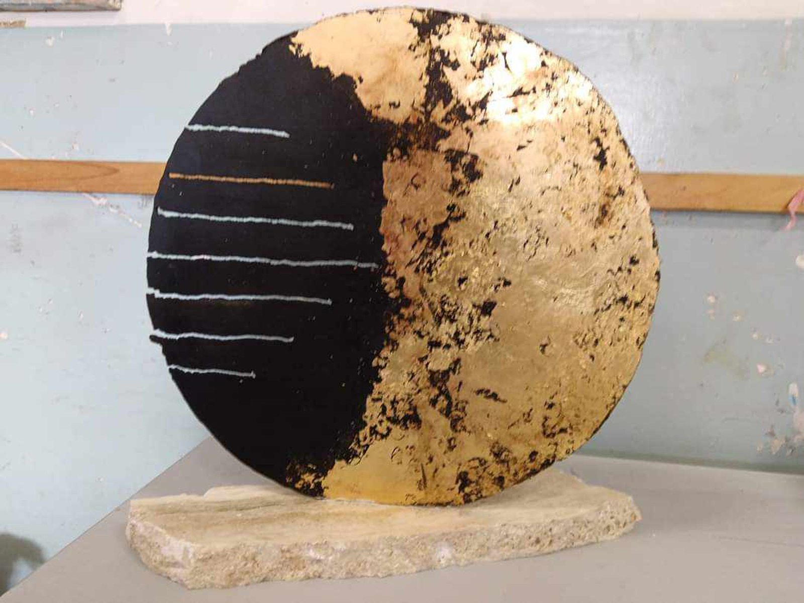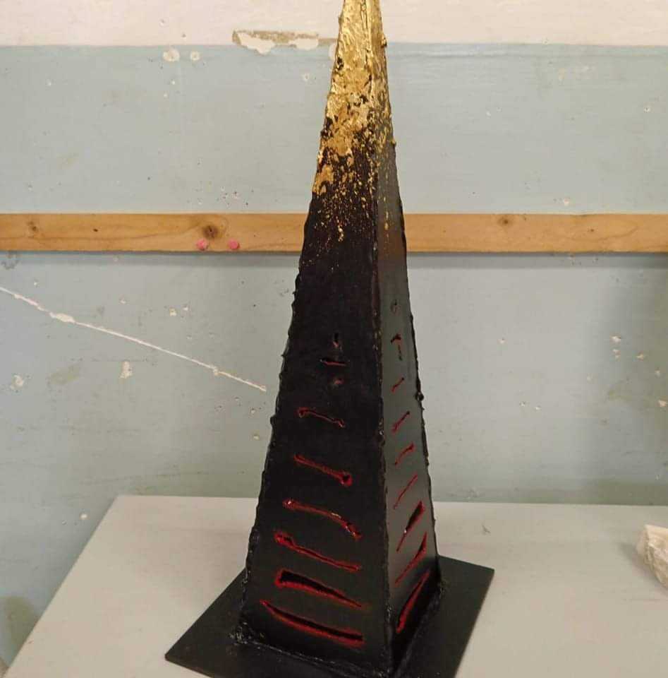 Simboli esoterici realizzati attraverso complesse procedure di fusione e saldatura prendono forma e vita davanti allo spettatore; obelischi, scudi e composizioni astratte hanno in comune una materia torturata, lacerata, una materia che grazie alla sua abilità si fa carne e si offre, orgogliosa e spoglia, allo sguardo di chi l’osserva. Colti sono i richiami all’arte di Alberto Burri, dove però era il fuoco ad infliggere alle sue superfici materiche bruciature ed ustioni così profonde da richiamare alla mente le antiche stimmate dei martiri cristiani. Qui è invece direttamente la mano dell’artista a torturare la materia, a squarciarla quasi con rabbia; quella stessa mano che prima plasma e poi lacera, alla fine la salva, la ricuce ed in questo modo la redime. Proprio in questo risiede buona parte del messaggio di Luciana Loccioni, che ci invita a riflettere sulla possibile rinascita che può sorgere da quelle lacerazioni, perché ogni ferita rappresenta anche una feritoia, una via per abbandonare la sofferenza patita e giungere a nuove e meritate consolazioni. Questo processo di comprensione viene realizzato con la luce, il colore e la materia; ogni squarcio è infatti attraversato da un raggio di luce che, penetrando all’interno delle forme, le illumina di nuove consapevolezze, così come le sfumature con cui sono realizzate le sue opere, capaci di creare colori che rifuggono il nero per giungere a originali e diverse affermazioni cromatiche, spesso permea te d’oro come forma di (rin)negazione del buio. La sua materia ha una voce propria; il filo di ferro con cui le ferite vengono ricucite dall’artista testimoniano quella sua capacità di estroflettere il proprio spirito verso il mondo esterno, la voglia di convogliare un messaggio attraverso una possibile redenzione.