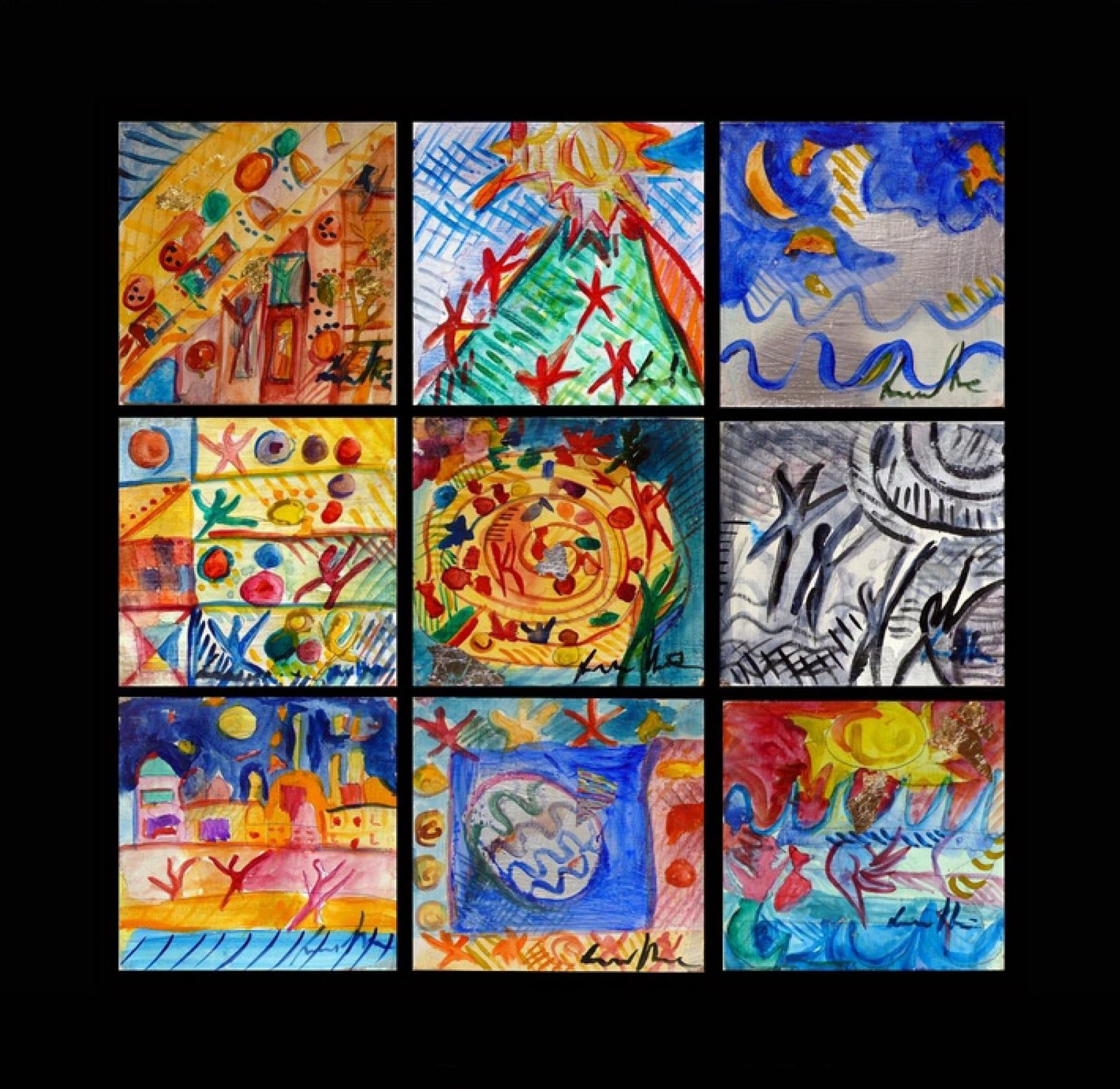 Il primo riferimento nelle opere di Luciana Trotta è il teatro, non tanto per la descrizione precisa della realtà rappresentata, quanto per il dinamismo vorticante delle scene. Le forme sono quindi ridotte a tratti essenziali, perse dalla policromia del movimento. Esattamente come nelle geometrie di Raoul Dufy, sono virgole monodimensionali inglobate nelle linee cinetiche di uno sfondo pieno e fauve nella sua quasi vivacità eccessiva. La saturazione di ogni superficie visualizza un’interiorità che deborda nella tensione sociale, come avveniva con l’Espressionismo di August Macke che, alla vigilia della Prima Guerra Mondiale, mostrava i funamboli del circo. E tuttavia, i mille mondi dell’artista godono di un respiro mediterraneo, influenzato da Matisse e dalla commedia napoletana. È una sintesi grafica che si nutre del segno estremo per sviluppare una ricerca sospesa tra intuizione e livello onirico dell’insieme. Ogni composizione va infatti letta nella sua complessità variabile, come un calendario ad elementi rotanti. Tempo e Spazio sono i protagonisti assoluti, non per il valore stagionale di ciascuna tavola ma per la sequenzialità narrativa della storia, composta secondo una struttura combinatoria che ricorda il metodo di Calvino o di Cortázar, sia all’interno di un singolo lavoro sia nella costruzione di un percorso espositivo personale. Nella creazione dei cicli epici della tradizione orale popolare, i cantastorie utilizzavano i diversi episodi concatenati in un ordine variabile, ma solo alcuni erano destinati a restare nella memoria del pubblico. Analogamente, qui lo spettatore interagisce con l’artista – burattinaia e coreografa – richiamando il proprio background culturale per interpretare questo Giardino dei Tarocchi. Il destino individuale è nascosto negli schizzi e nell’uso forte dei primari che, accostati, generano un effetto musicale al contempo dissonante e armonico.