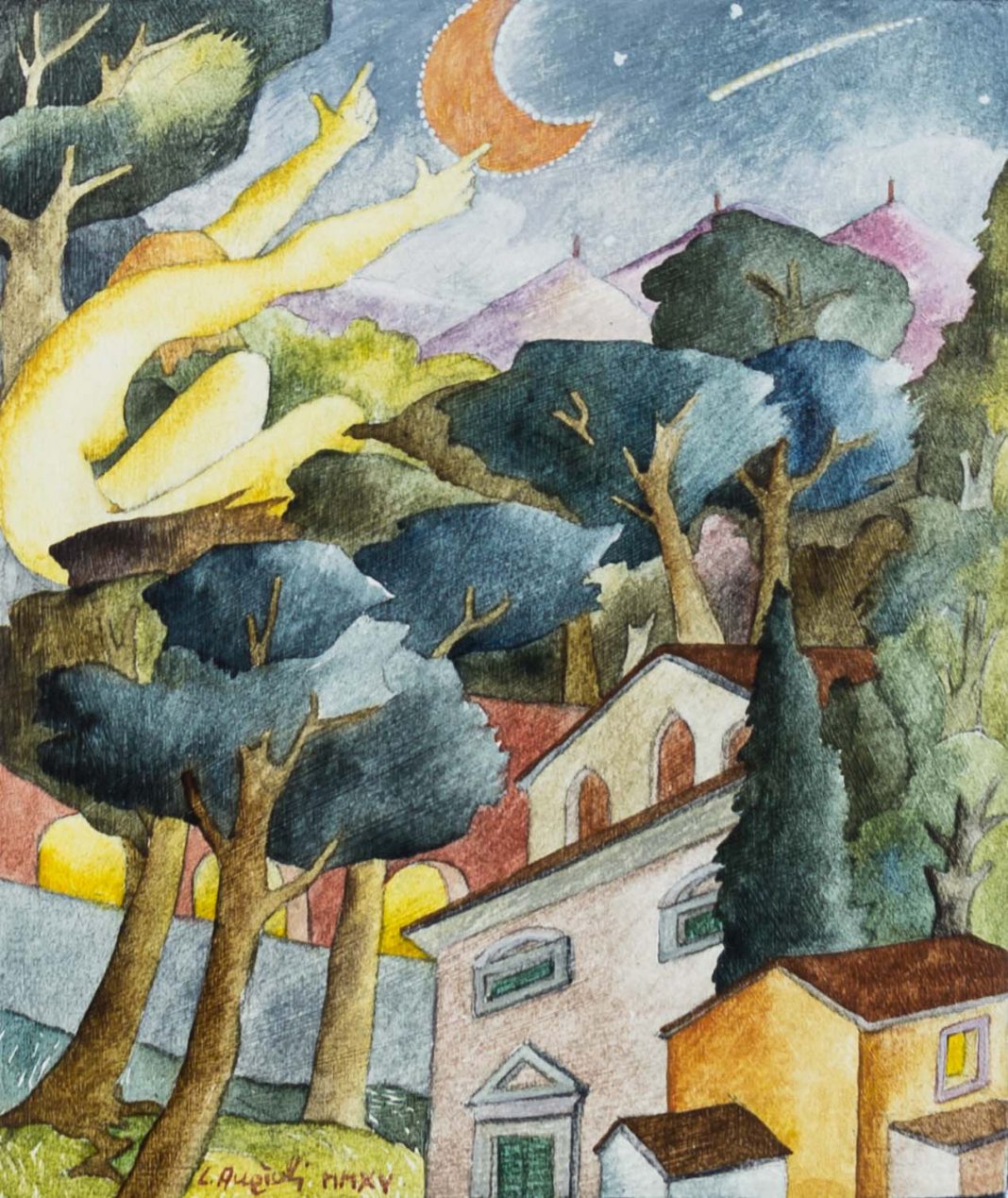 Angioli gioca invece con forme e colori: le sue opere vivono autonomamente su piccoli “oggetti” di legno, e l'iniziale impressione naïf che ci trasmette il suo lavoro, lascia velocemente spazio a quella che si rivela essere una grande attenzione al dettaglio, alla composizione e alla scelta cromatica.