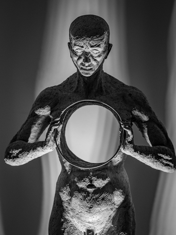 La mostra si compone da una serie di sculture in terracotta legate dal motivo ricorrente del cerchio, elemento che accompagna lo spettatore a meditare sul concetto di vuoto esistenziale. Sentimento che assume forma tangibile, diventando un vuoto fisico, concreto, un’inappagabile fame, capace allo stesso tempo, di divorarci dall’interno. Personaggi anonimi, figli di un’estetica classica privati della loro totalità, squarciati da una crescente fragilità generata, tanto da beceri standard sociali, quanto da un indomabile senso di inadeguatezza. “Into the Void” esplora la costante paura del fallimento, l’incontrollabile ansia del non riuscire, l’offuscante panico dell’ignoto, l’alienante voce interiore che ci giudica senza tregua.