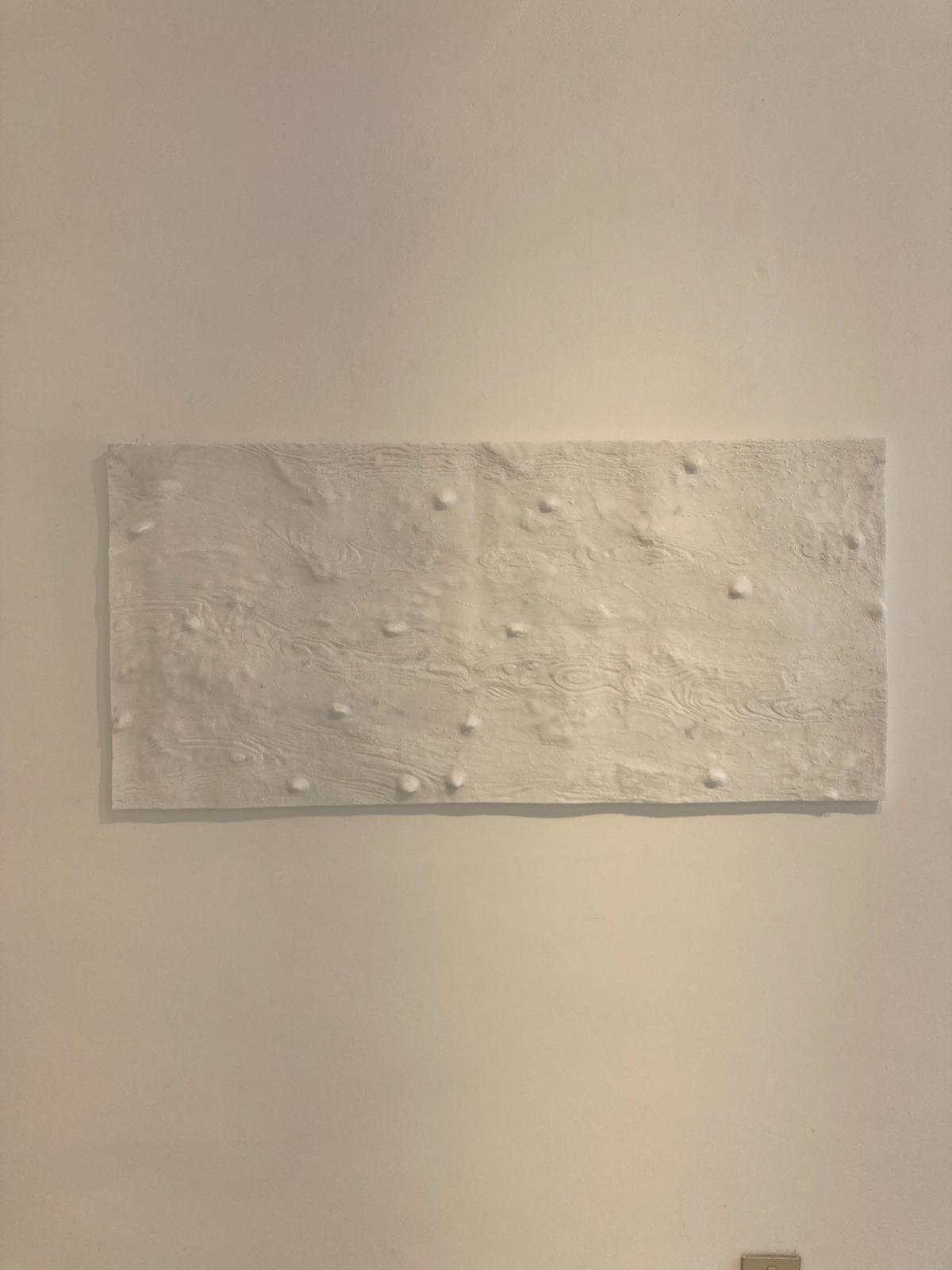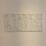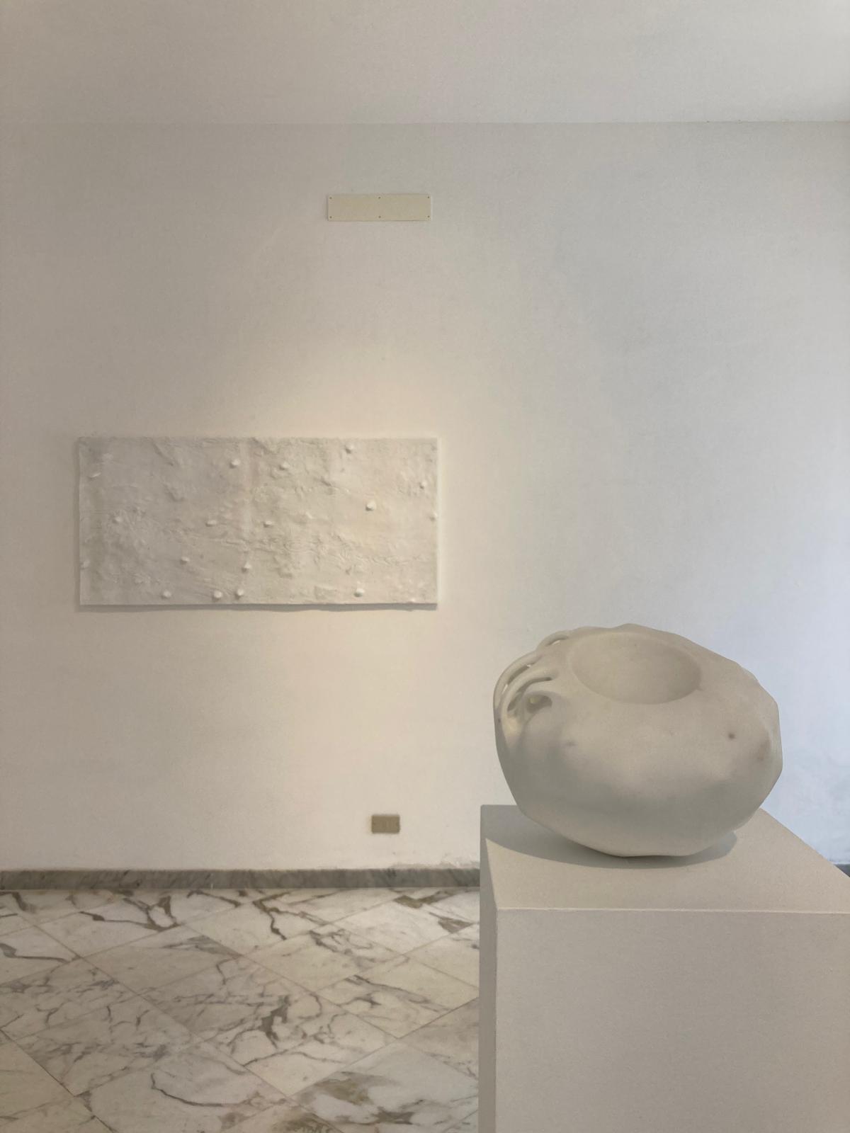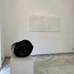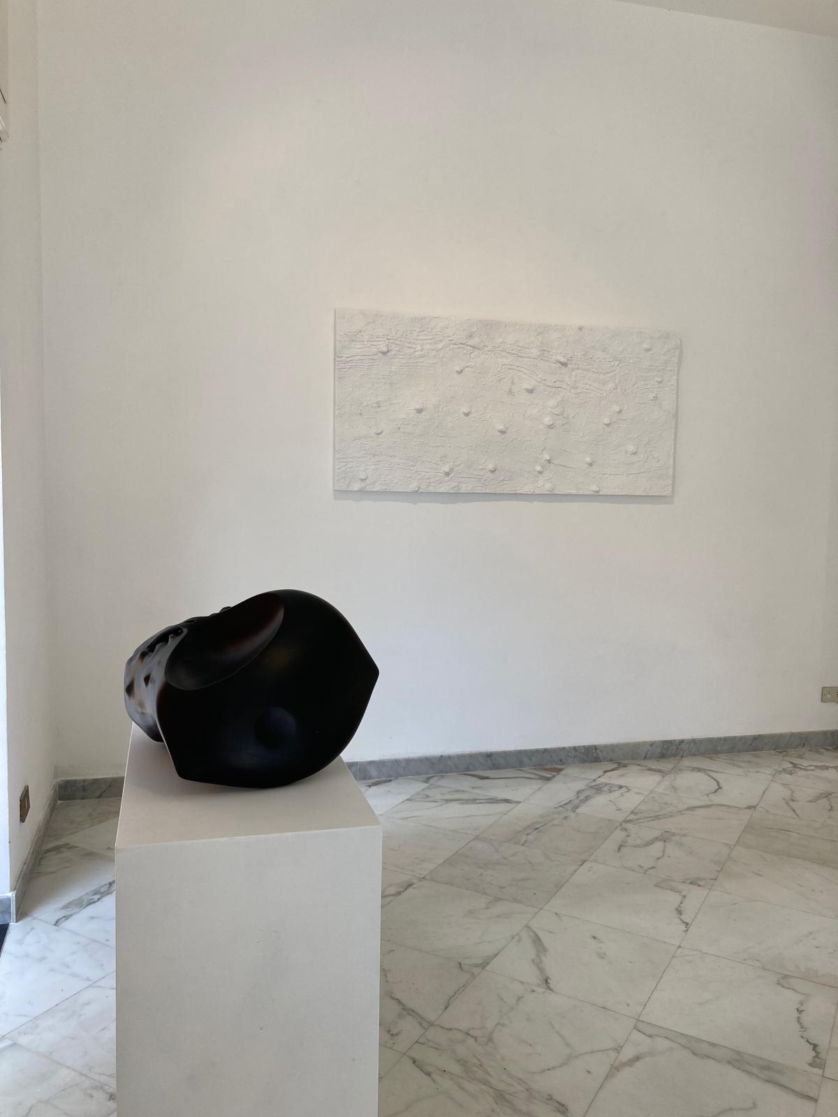 Insieme a queste superfici anche opere tridimensionali, “Meteore”, oggetti frutto di perizia artistica, ma che sembrano avere acquisito forme aerodinamiche attraversando spazi interstellari, consumate dalla rapida caduta. Appaiono allacciate da stringhe ondeggianti, quasi che il senso di movimento abbia preso forma, si sia consolidato e viene voglia di aprirle per portare fuori la vita che nascondono