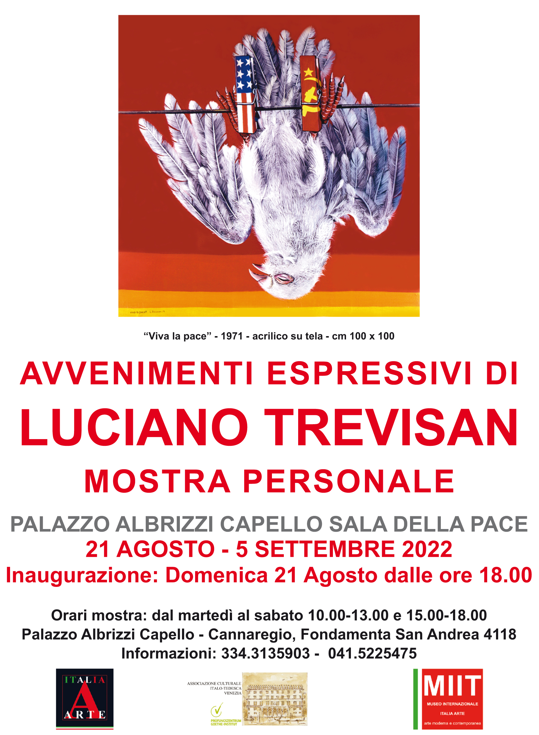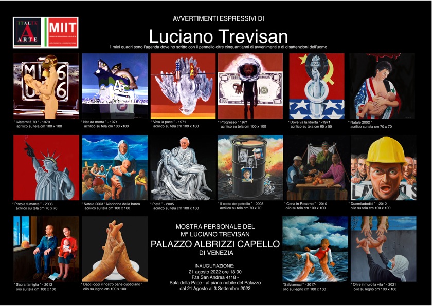 La grande esposizione dedicata al Maestro veneto Luciano Trevisan a Palazzo Albrizzi Capello, sede storica dell’ACIT, Associazione Culturale Italo Tedesca che ospita regolarmente i padiglioni stranieri e gli eventi collaterali della Biennale Internazionale d’Arte di Venezia, vuole ripercorrere, unico caso al mondo e mai prima verificatosi, 50 anni di avvenimenti storici, in un viaggio suggestivo, visionario e profetico che ha anticipato fatti, drammi e, infine, disilluse speranze e crude consapevolezze contemporanee con decenni di anticipo.