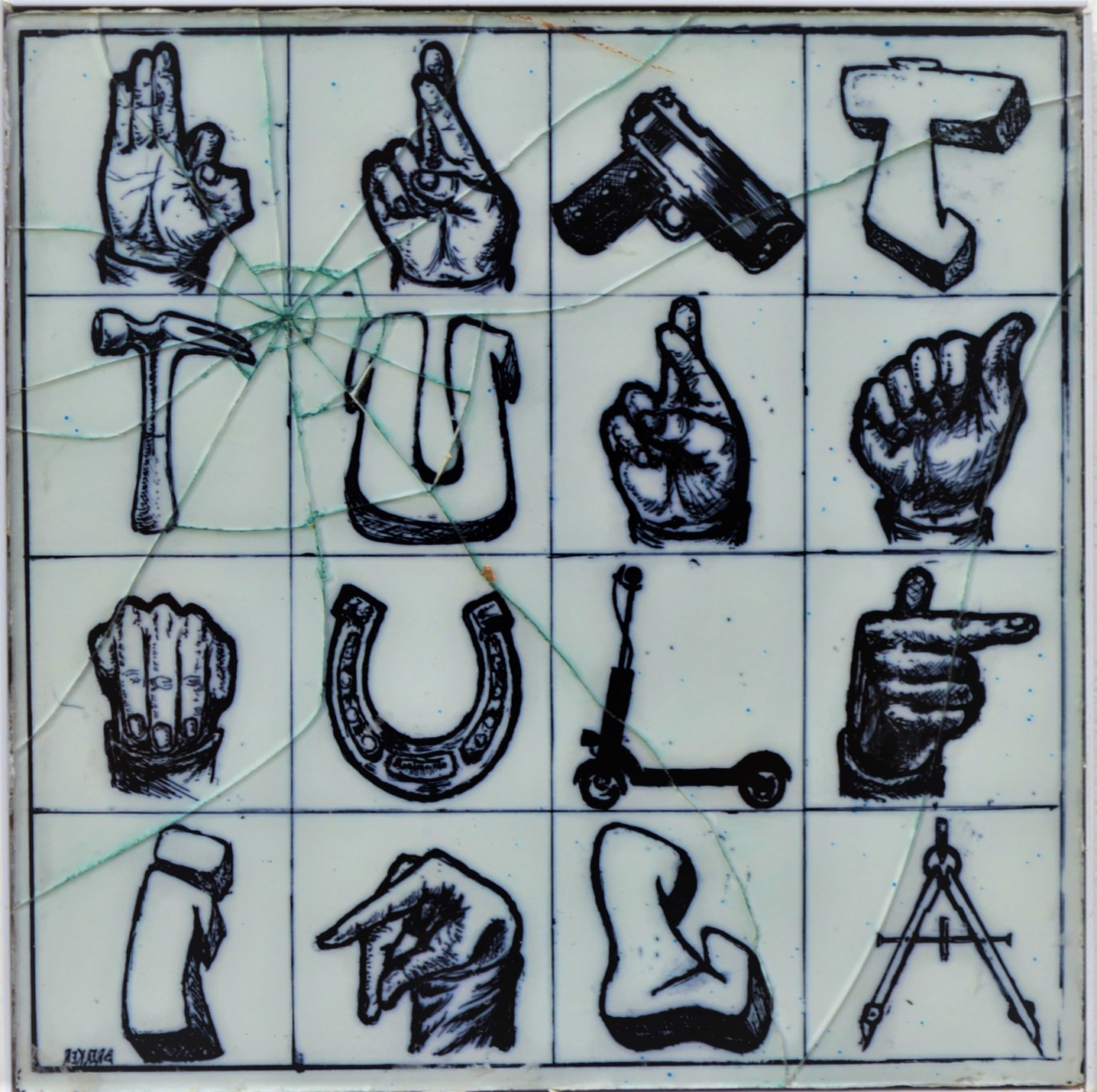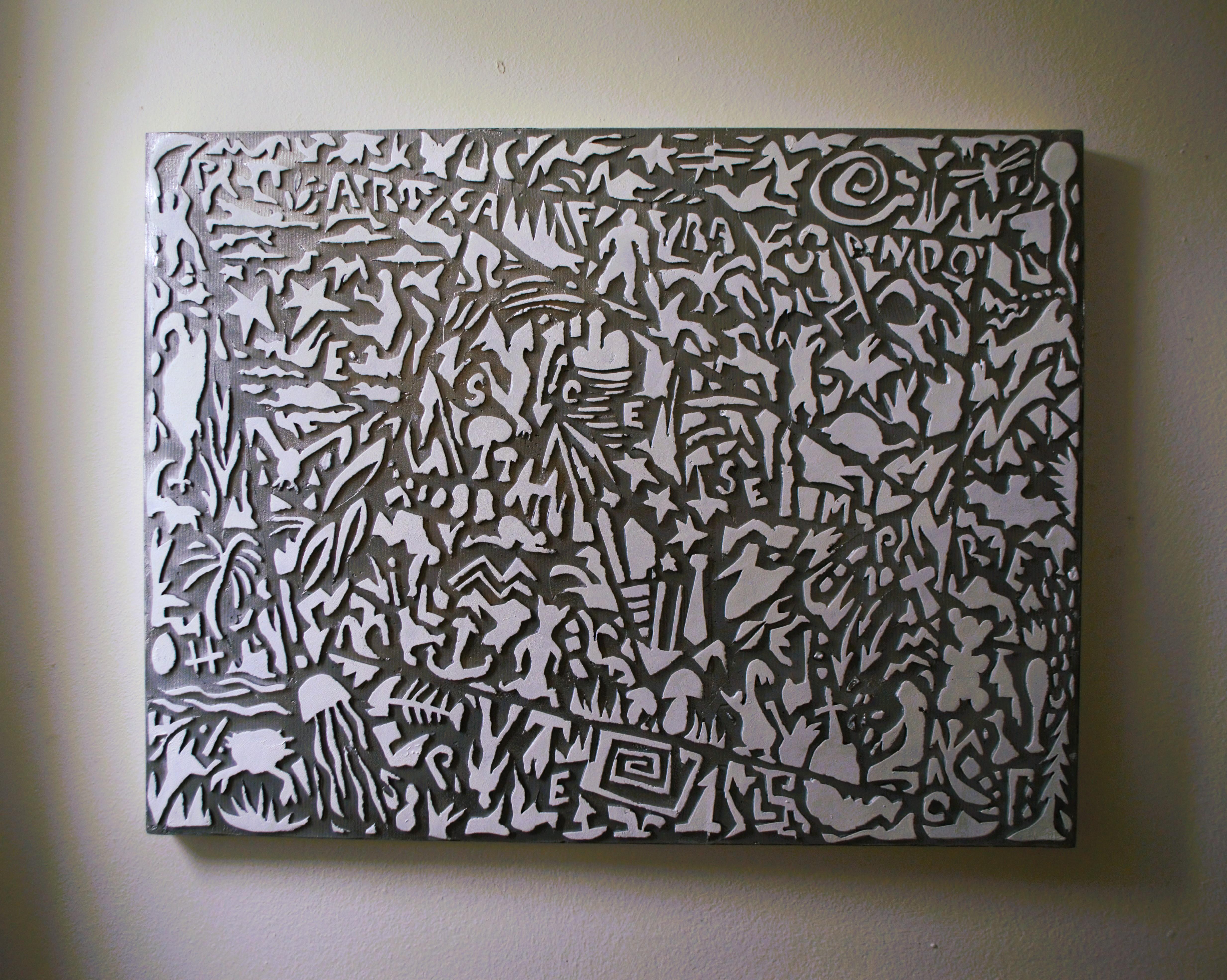 Il corpus di opere chiamato Rebus invita lo spettatore ad immergersi nel caotico intrico di segni, simboli e parole per completare l’esperienza estetica con la ricerca attiva e trovare il suo significato profondo risolveldosi, esso stesso, nella risoluzine del rebus.