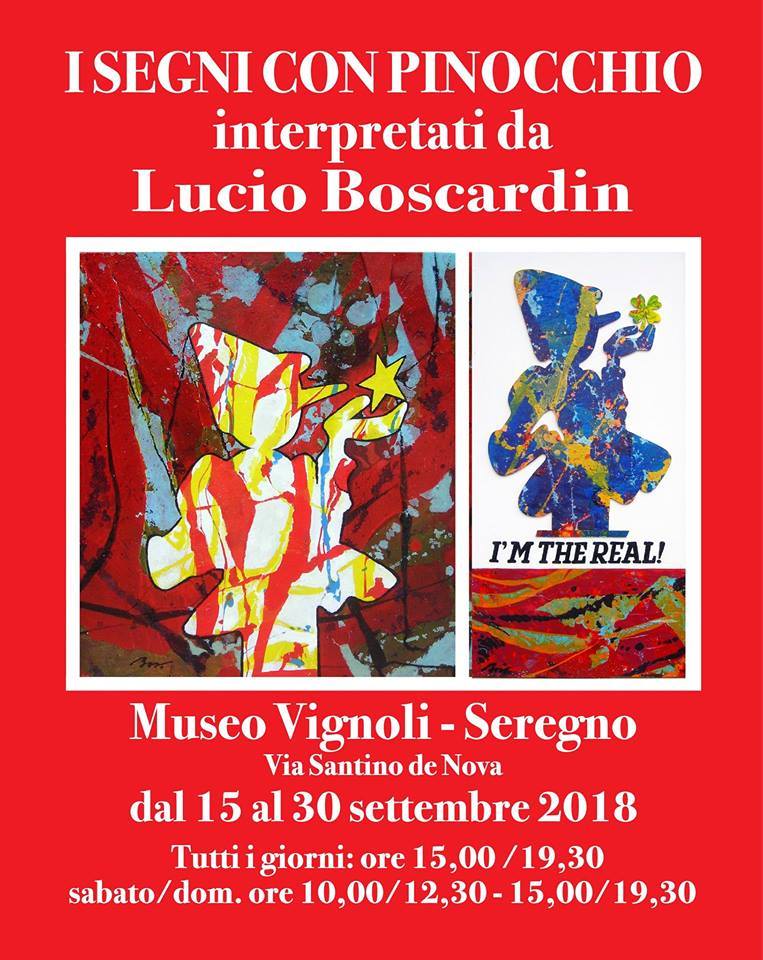 La rassegna “I segni con Pinocchio” è una mostra personale di Lucio Boscardin, art director della Fondazione Nazionale Carlo Collodi. Le opere esposte sono tutte delle riflessioni sull’immagine grafica di Pinocchio, in cui la figura del celebre burattino emerge da sfondi policromi intagliati.