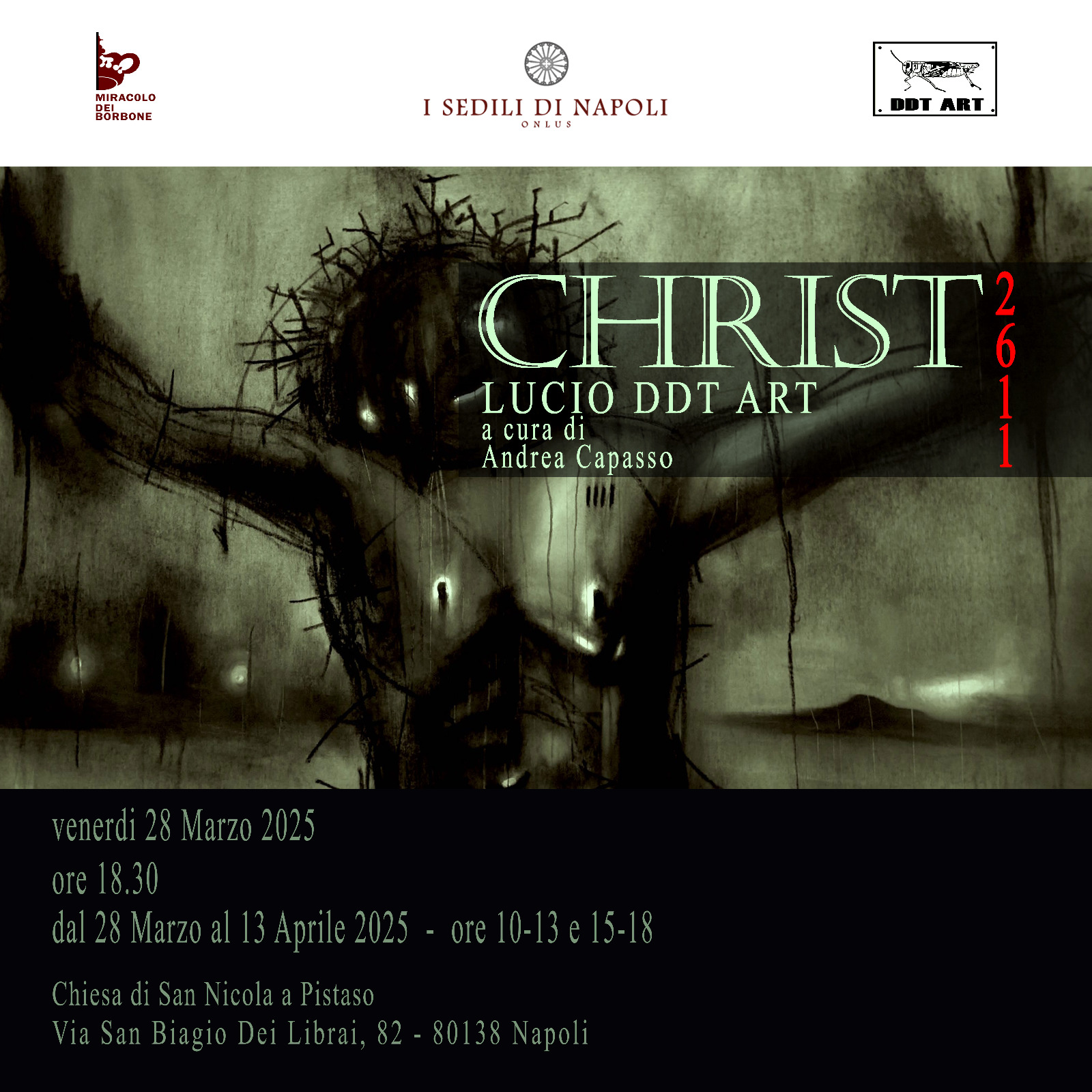 Lucio DDT ART presenta il suo dipinto “Christ 2611″presso la Chiesa di San Nicola a Pistaso (Napoli). Il Prof. Andrea Capasso terrà una relazione critica sul dipinto suddetto. La mostra è organizzata dall’Associazione “I Sedili di Napoli”.