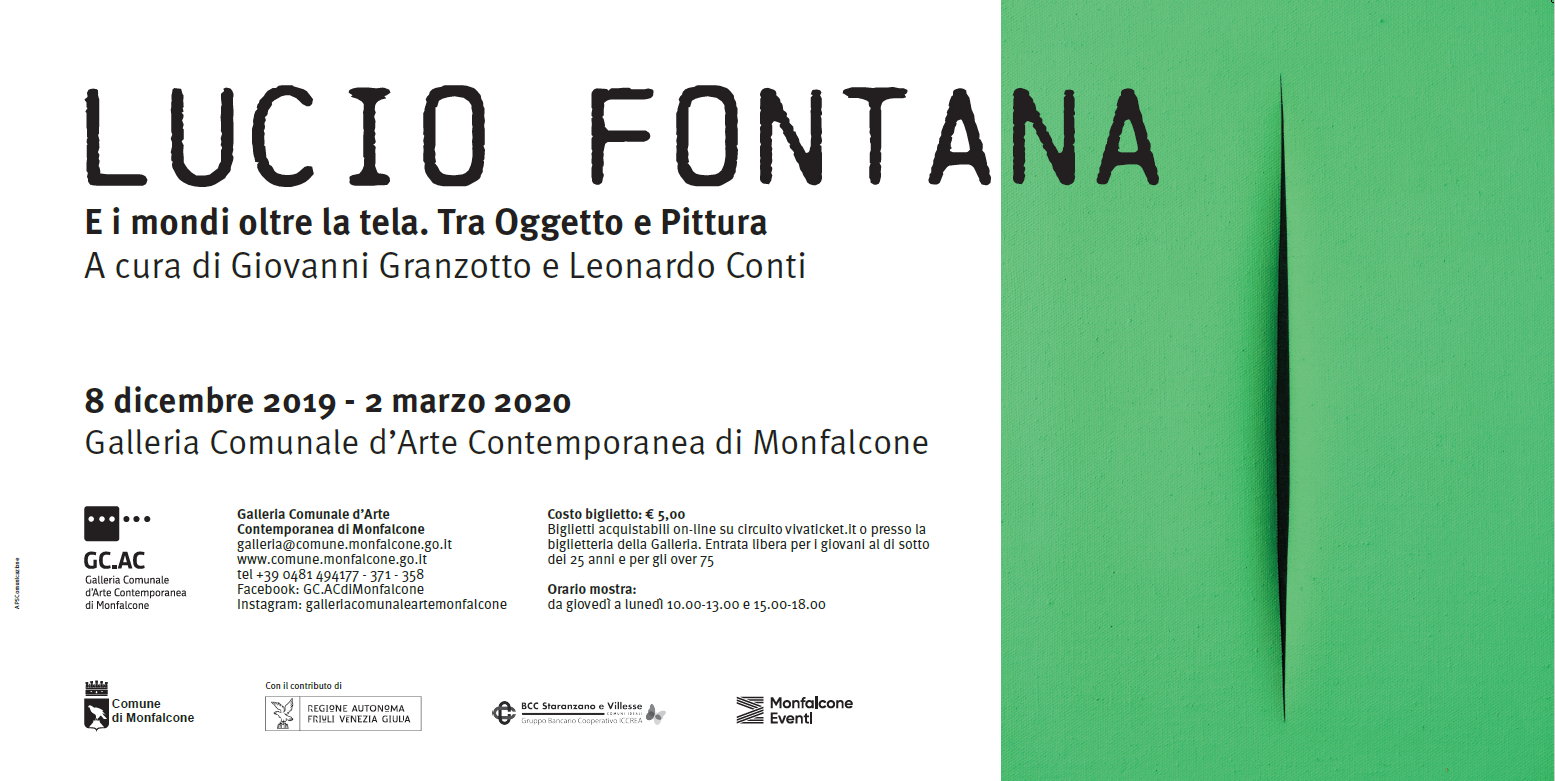 La mostra Lucio Fontana e i mondi oltre la tela. Tra Oggetto e Pittura, a cura di Giovanni Granzotto e Leonardo Conti, si terrà dall’8 dicembre 2019 al 2 marzo 2020, nella Galleria Comunale d’Arte Contemporanea di Monfalcone, promossa dall’Amministrazione del Comune di Monfalcone per innalzare ulteriormente la sua offerta espositiva e culturale.