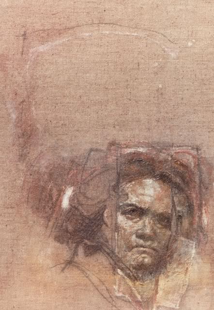 Nella mostra è affrontato questo duplice interesse: per la musica, con alcune principali opere storiche dell’artista (Beethoven, del 1975, la tela più esposta, e Sequenza, del 1987) e lavori più recenti; e per il cinema, con una serie di disegni ispirati ai capolavori di Sergio Leone.