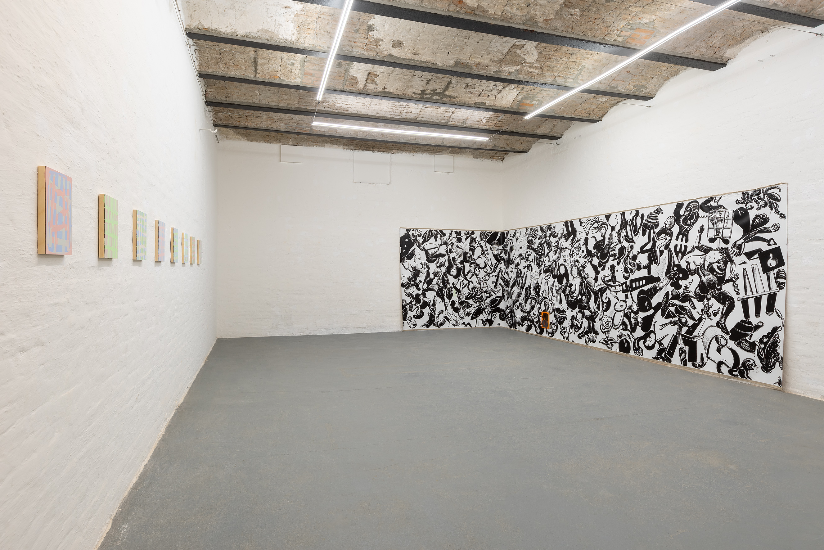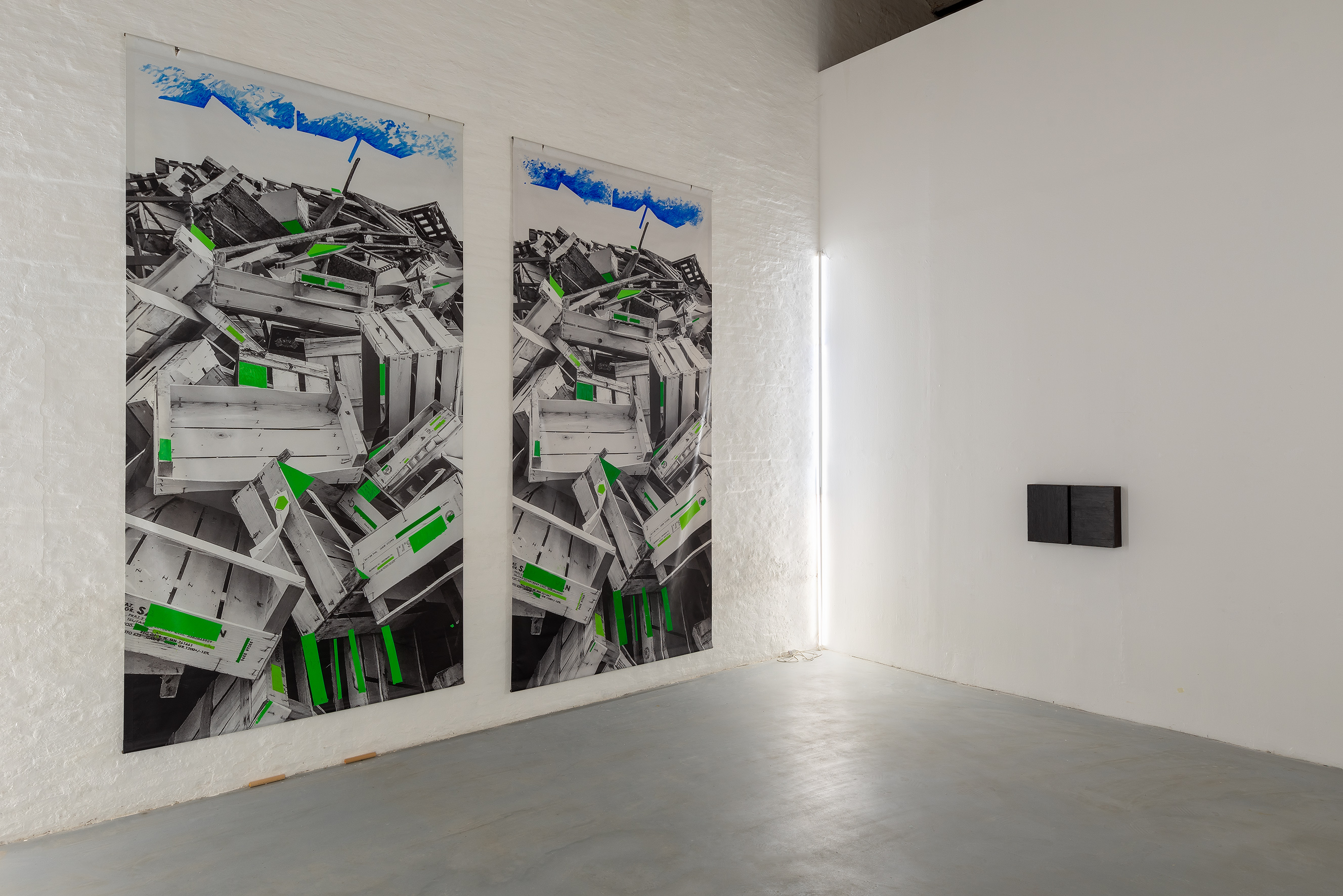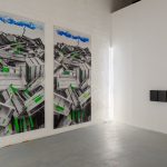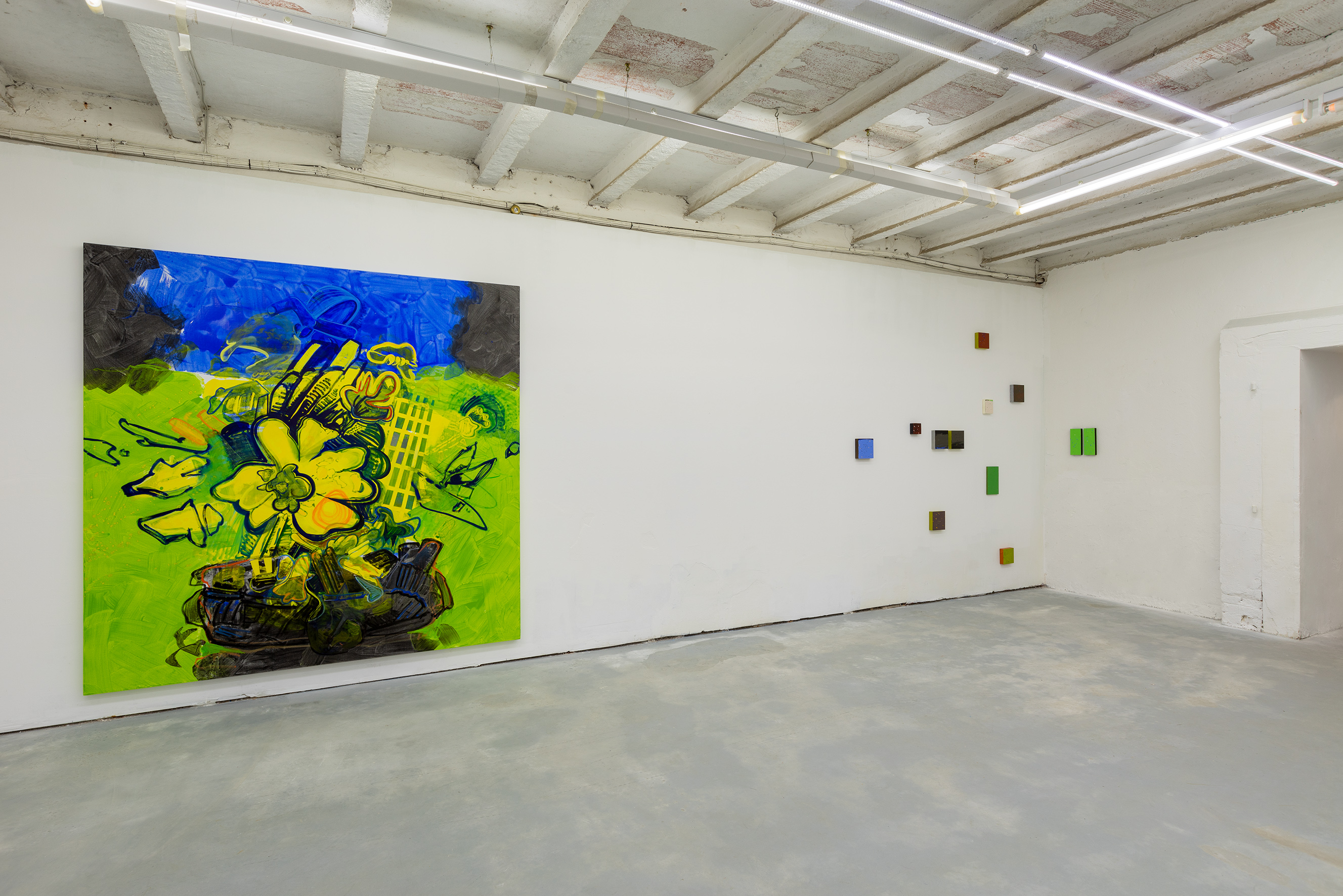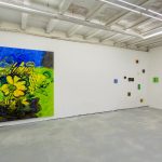 Così, in mostra, può capitare che nella stessa sala si fronteggino un dittico appartenente alla serie dei Level Group (dove coppie di dipinti, apparentemente simili, attivano uno scambio energetico che si fonda sul gesto, sulla direzione delle pennellate, sull’incidenza della luce, sul rapporto tra spessore dei bordi e superfici); un grande lavoro di derivazione fotografica (ancora una coppia di immagini) in cui poche essenziali pennellate seguono i movimenti, fin quasi a confondersi con essi, di un cumulo di cassette di legno trovate per caso e fotografate in una discarica; uno Scatter Painting basato sullo “sparpagliamento” di linee, segni e campiture sulla superficie, su un’agilità di forme e colori capace di generare un non- finito perpetuo. E ancora: può accadere, in mostra, che un grande lavoro figurativo come Storia, in cui forme e contorni di cose riconducibili al reale e altre più difficilmente riconoscibili compongono una partitura di narrazioni ipotetiche e un’infinita gamma di cambiamenti di scala e punti di vista, sia in dialogo con una serie recente di Overlap Paintings, ancora sovrapposizioni tra forme e piani dell’immagine, ma rigorosamente organizzati in una partitura astratta dai toni pastello; o che l’ultimo, grande “fiore” realizzato dall’artista, un’immagine monumentale e al contempo iridescente, si trovi accanto a una costellazione di piccoli dipinti astratti appartenenti ad alcune delle sue serie più emblematiche.