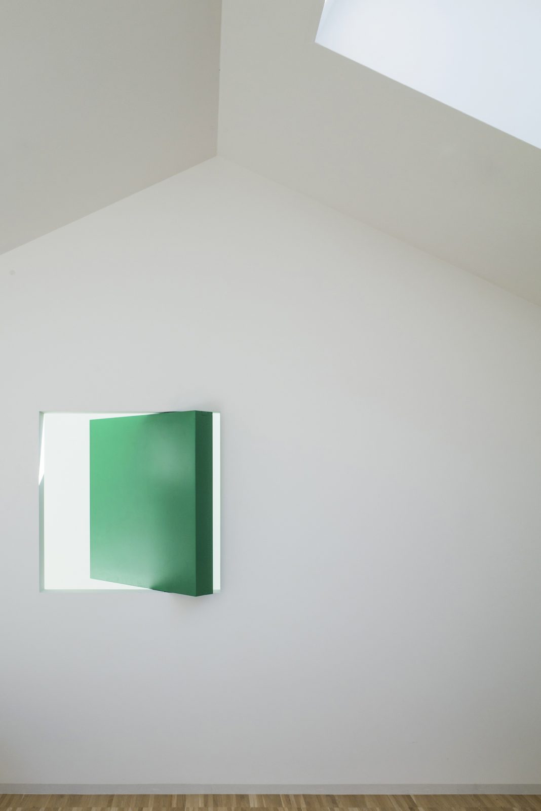 legato a questa riflessione progettuale è anche Casa dentro, un lavoro composto da due sagome di casa a dimensione di uomo, poggiate sulla parete bianca, che accennano, come fossero ali, ad un movimento; la prima di colore grigio cemento ha la faccia interna nera che si riflette, insieme a noi, nell’altra sagoma fatta di specchio per farci essere dentro, insieme nel riflesso, nella casa dell’accoglienza