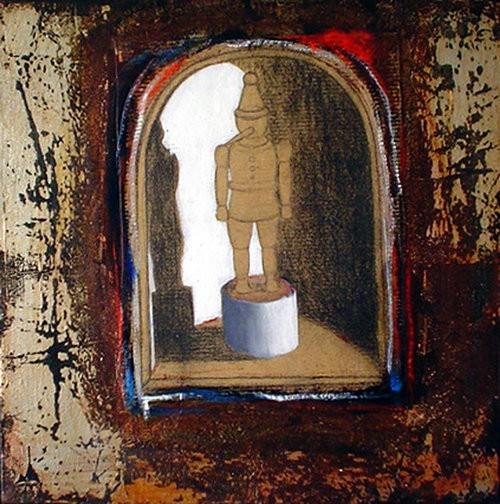 Una delle opere piu' rappresentative della sua poetica e' “Il burattino ieratico", che raffigura una marionetta all’interno di un’edicola sacra. In un intrigante gioco delle parti, il burattino assume un’aura di santita', mentre l’edicola che lo accoglie perde la sacralita' che noi adulti le attribuiamo per diventare cio' che realmente e': una cornice che valorizza il suo contenuto. L’artista, suggerendo che non dovremmo prendere tutto sul serio, ci fa riflettere sul reale significato delle cose, che spesso non coincide con quello che noi riteniamo tale.