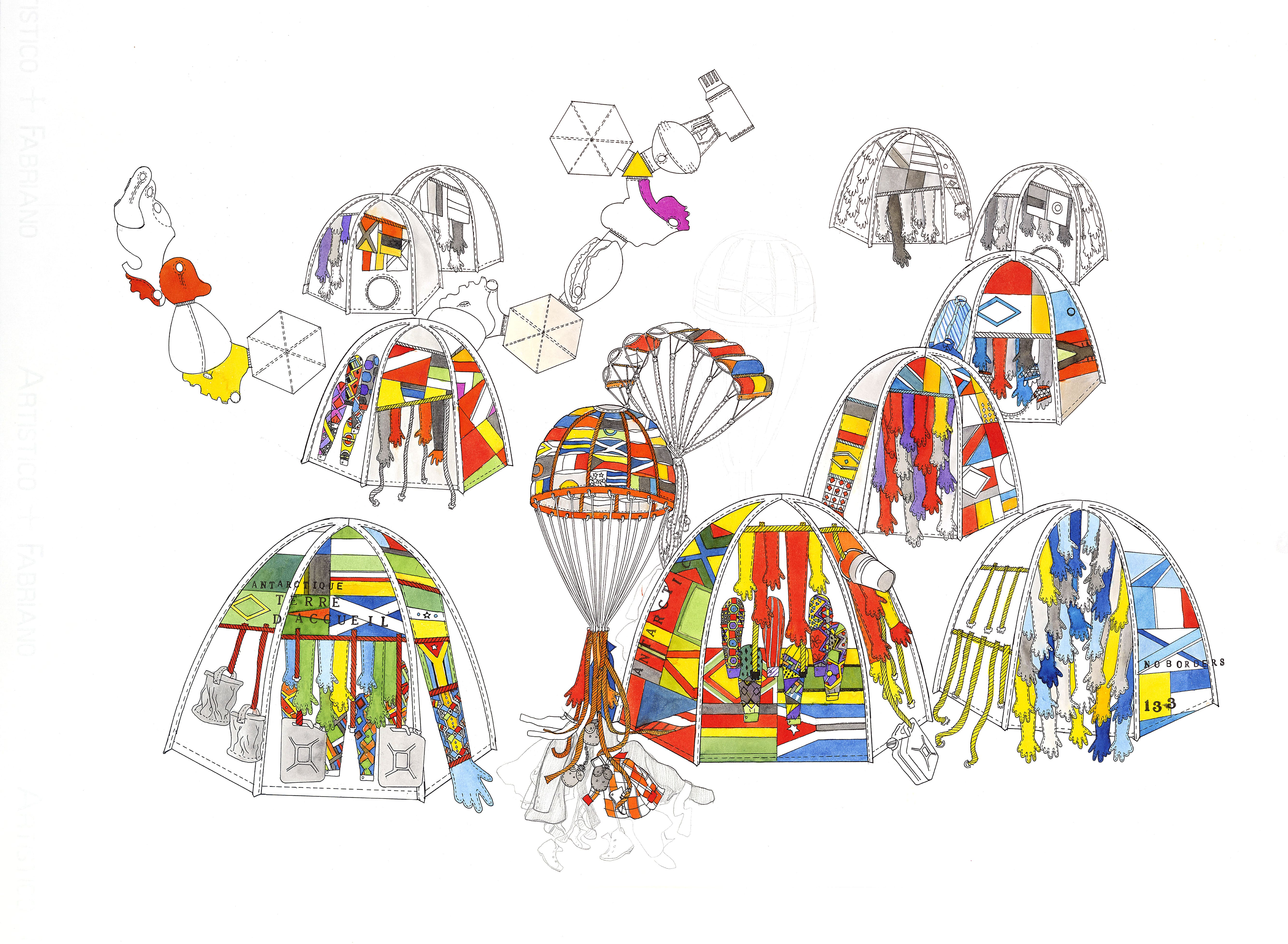 L'Antarctica Dome Dwelling, parte di un progetto più ampio nato da una spedizione in Antartide, incarna l'utopia di un luogo dalla natura incontaminata, senza popolazione indigena e, di conseguenza, senza interessi politici o ideologici. Una terra in cui decine di tende realizzate con frammenti di bandiere di Paesi di tutto il mondo, insieme a prolungamenti di abiti e guanti, che simboleggiano la molteplicità e la diversità delle popolazioni, possono essere erette per creare un utopico villaggio globale per diffondere un messaggio di speranza per le generazioni future.