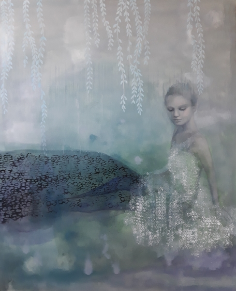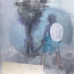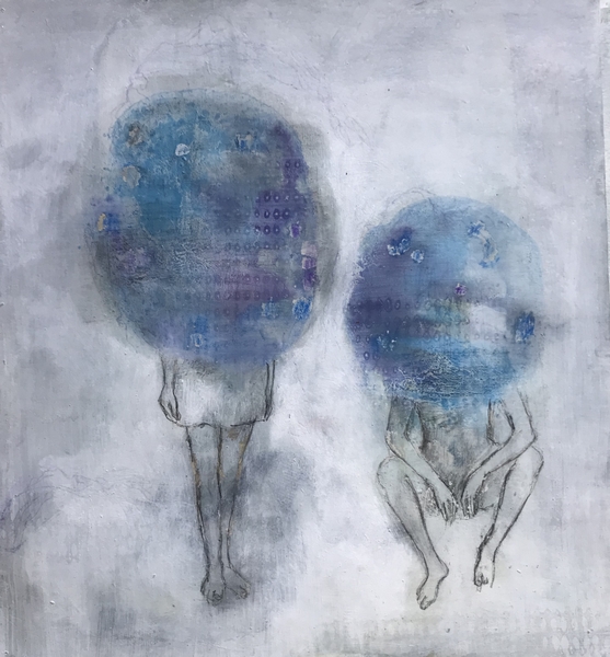 «Quest’ultima pratica – spiega la curatrice – crea un parallelismo tra le acque fresche di un lago di montagna e la mente umana. Se l’acqua calma riflette fedelmente il dato naturale, paure ed eccessivi attaccamenti ne increspano la superficie, distorcendo l’immagine finale. Attraverso la meditazione, il lago agitato torna allo stato di quiete e diventa un luogo sicuro all’interno del quale fare periodicamente ritorno. Non è un caso che l’immagine guida di questa mostra rappresenti due figure femminili, una in piedi e l’altra seduta, con il capo immerso in un globo acqueo. Paesaggi liquidi, quelli di Ludmila Kazinkina, che ricorrono sia nelle opere su carta di piccole dimensioni, dove convivono olio e grafite, ma anche piccoli elementi a collage e pattern modulari, sia nei dipinti ad olio su tela di grandi dimensioni, a volte accostati a formare dittici».