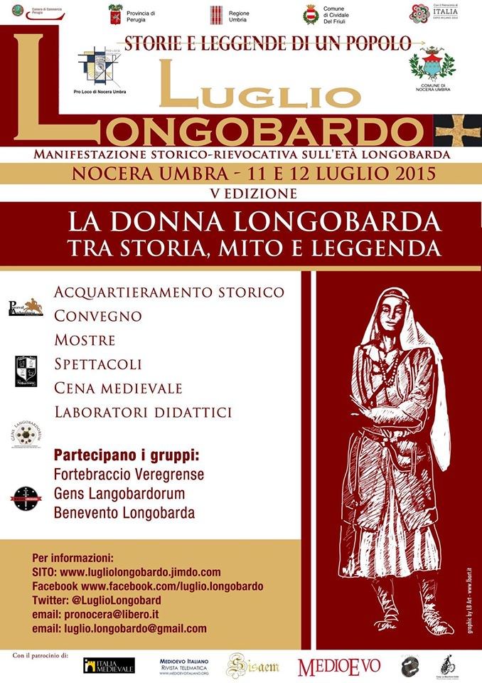 “Luglio Longobardo 2015” è organizzato da Pro Loco Nocera Umbra in collaborazione con Scuola di Scherma Antica Fortebraccio Veregrense e Perceval Archeostoria e si avvale del patrocinio istituzionale di Comune di Nocera Umbra, Provincia di Perugia, Regione Umbria, Camera di Commercio di Perugia, Comune di Cividale del Friuli (Ud), Padiglione Italia Expo Milano 2015, e del patrocinio culturale di mensile “Medioevo”, E.M.A.i.A. (Early Middle Ages In Action), Associazione Culturale Italia Medievale, SISAEM (Società Internazionale per lo Studio dell'Adriatico nell'Età Medievale), “Medioevo Italiano rivista telematica”. Multimedia partner: La Storia Viva.