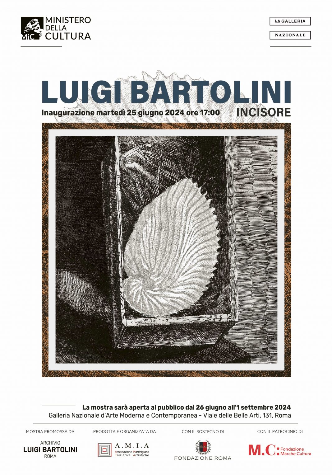 Fortemente voluta dalla figlia, Luciana Bartolini, che presiede l’Archivio Luigi Bartolini, la mostra è ospitata dalla Galleria Nazionale d’Arte Moderna e Contemporanea di Roma, dal 25 giugno al 1° settembre 2024, e segue le esposizioni a lui già dedicate recentemente a Macerata (Musei Civici di Palazzo Buonaccorsi) e Urbino (Palazzo Ducale).
