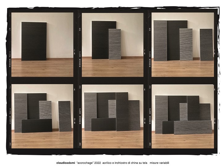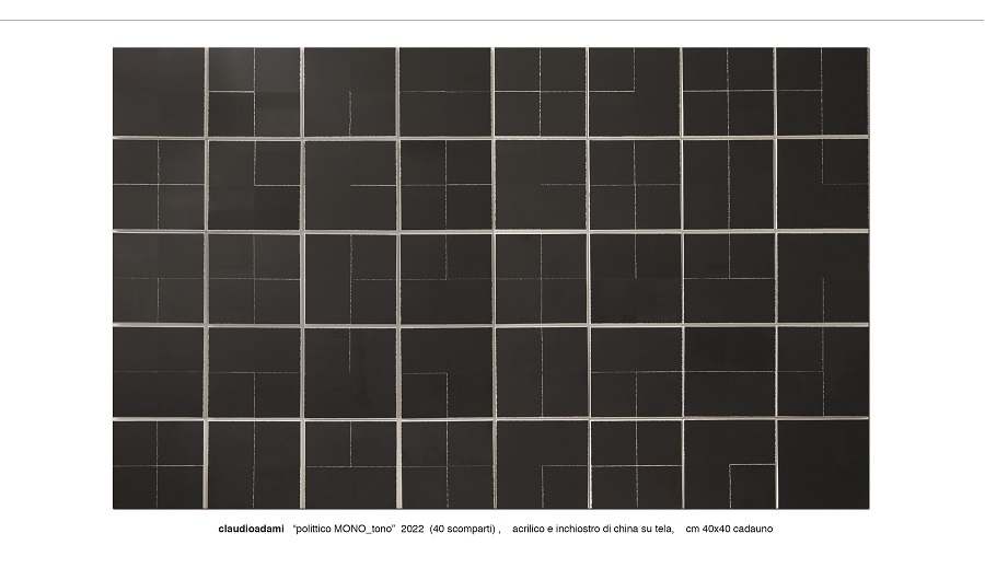 Da qui il “MONO_tono” (2022) che tradisce la passione di claudioadami per il Minimalismo, con i suoi quaranta scomparti quadrati, ognuno di 40 cm di base, di fatto un modulo; e le sette tele nell’Accrochage (2022) dette componimenti, sono moduli di diverse gradazioni di nero che “si comportano” come movimenti musicali liberi perennemente in cerca di un luogo stabile.