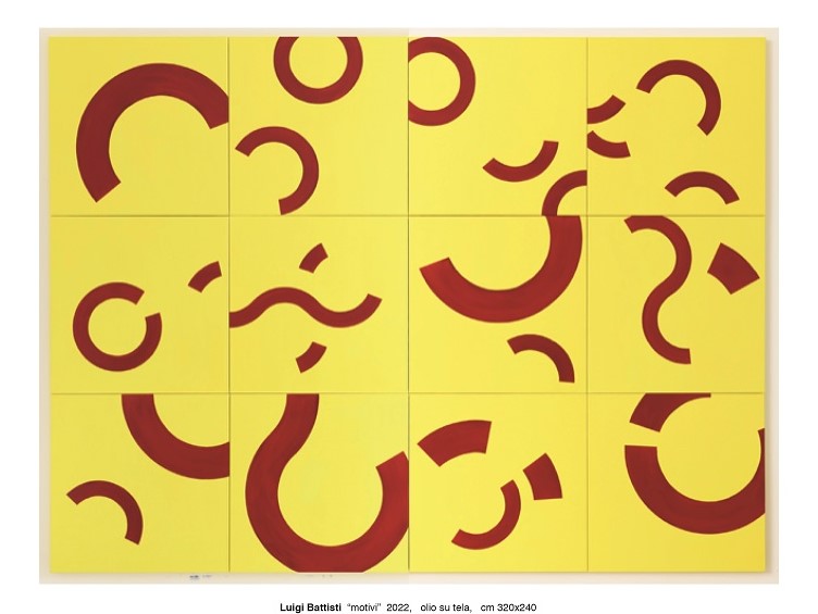 In “Rombo”, tra le prime opere di Luigi Battisti, è già presente l’appropriazione dello spazio, occupato da nove elementi in legno dipinto, elaborati in variazioni ripetute ma non identiche. La geometria, il modulo e la serialità insistono e costituiscono il punto base della sua stessa ricerca, spesso attorno al quadrato con precise regole e delle cosiddette “mitologie” come le opere musicali di Erik Satie, John Cage e Morton Feldman, delle quali memorizza i tempi dei suoni e dei silenzi, facendoli diventare vuoti e pieni, attraverso i codici e cifre dei rapporti che nascono all’interno della struttura compositiva. Ed è infatti in questa logica che vengono realizzati l’arazzo “Neither” (2023), dedicato a Morton Feldman, fine collezionista di tappeti, e “Motivi” (2022), un dipinto di grandi dimensioni costruito “a tasselli” che ripropongono in modo astratto i motivi di tappeti tibetani, componimenti modulari che l’artista ha concepito autonomamente e che dunque potrebbero variare di posizione.