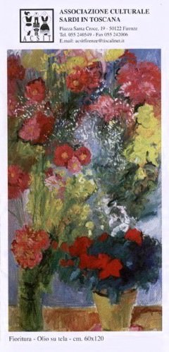 La mostra di De Giovanni, all’Associazione Culturale Sardi in Toscana a Firenze, è quindi un’occasione d’incontro con l’interpretazione che l’artista da dei colori e dei climi dell’isola. Sembra di avvertire i profumi, sia della vegetazione che dei fiori, davanti ai quadri di paesaggi marini, di montagna o delle composizioni di fiori riuniti in mazzi dall’aspetto selvaggio come selvaggia è la terra Sarda.