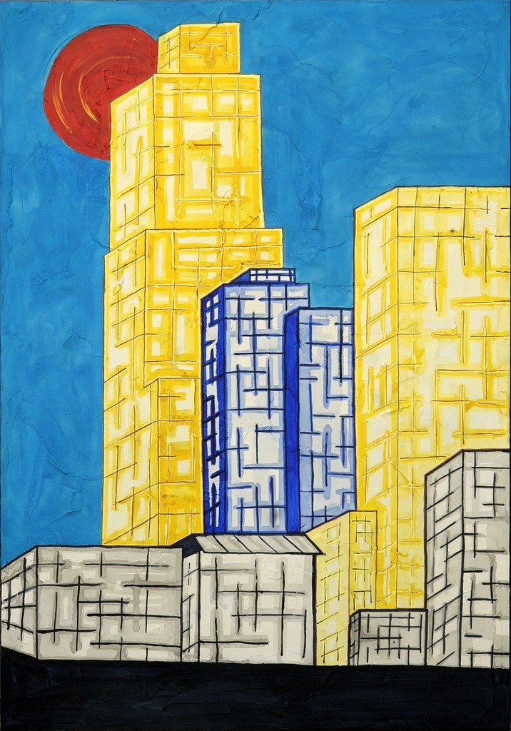 L’artista presenta una selezione di opere dell’ultimo anno di lavoro, in cui si evidenzia, come sua primaria scelta, la tematica della città. Grattacieli in ardite prospettive e cieli che si stagliano accentuando la concezione verticale del quadro. Accanto ai quadri, nello spazio della galleria, Mosca colloca alcune leggere sculture in rete metallica, che evocano figure angeliche