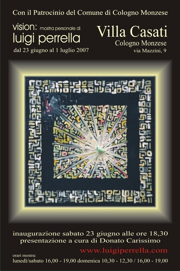 Dal 23 giugno al 1° luglio prossimi, venti d’arte soffieranno in Villa Casati con la mostra personale dei dipinti del pittore triestino Luigi Perrella, che ritorna nella nostra città con la raccolta vision e con un’opera realizzata in quest’ultimo anno espressamente per essere presentata in questa bella e prestigiosa sede, che concorre a dare lustro agli artisti che vi espongono, ma che altrettanto ne riceve.