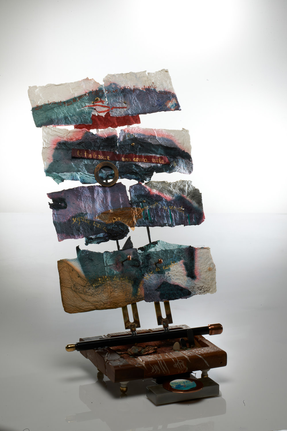 La carta, tutta realizzata a mano, vedrà nelle composizioni l'inserimento di parti plurimateriche (realizzate da Ignazio Bellini) come sottolineatura dell'unione di pietra e spazi ferrinei. Per questi spazi metallici sono stati scelti il ferro e il piombo che, per la matericità, può ricordare la pietra stessa. I metalli sono stati tenuti alle intemperie perchè assumessero colorazioni inconsuete vivendo un processo di trasmutazione e si caricassero di potere suggestivo.