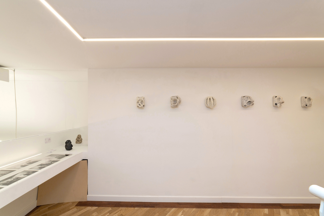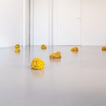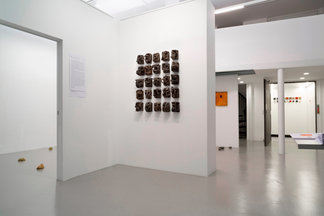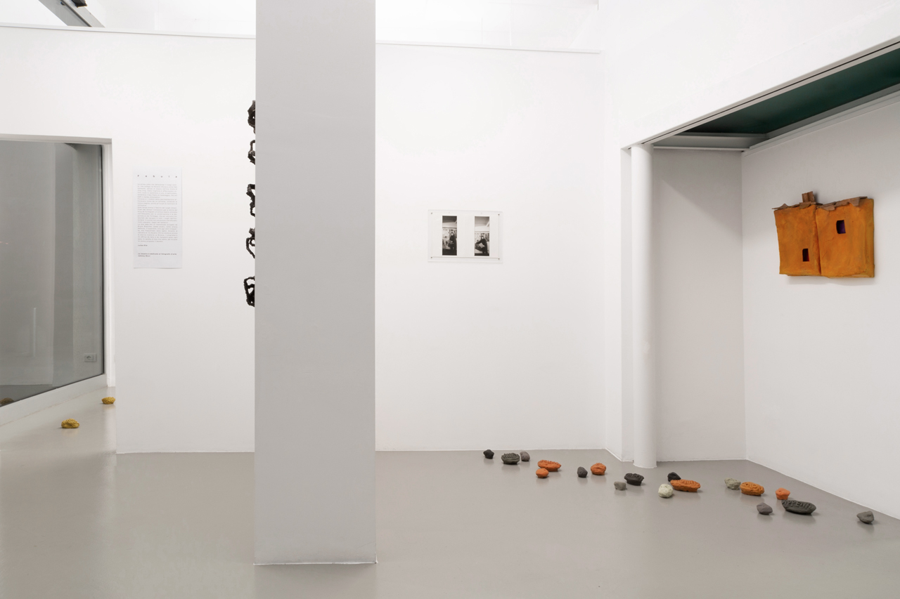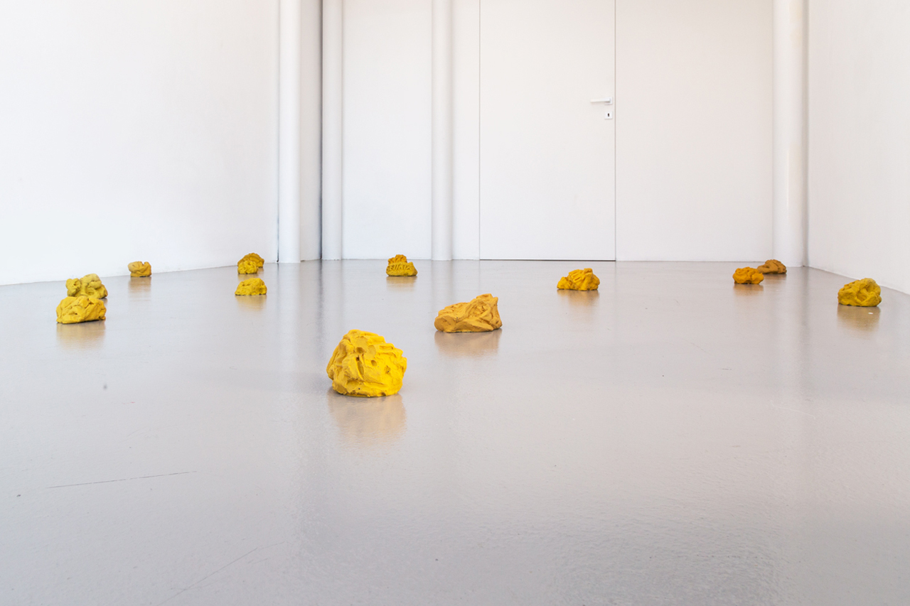 due installazioni a terra di fusioni in gomma e inchiostri, con in rilievo alcuni versi e una breve lirica della stessa artista. Rime petrose è una disseminazione di quindici sculture dalle tonalità ocra, con il seguente testo in dialetto leccese: “Stau settata e sia ca ballu e lu niuru me pare giallu” (Sono seduta ma mi sembra di ballare e il nero mi pare giallo). In Pallido meriggio ti colori appena il cromatismo, nelle sue varianti e gradazioni, cattura il passaggio di uno stato d’animo, in chiave esistenzialista e