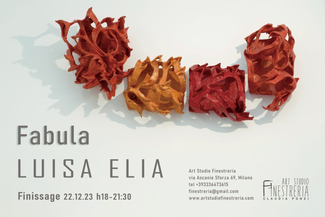 anni Novanta, a Milano e a Lecce, accompagnate da un testo critico di Pierre Restany. Fabula, a parete, si snoda attraverso quattro elementi, in cui il vuoto è l’aspetto predominante. Fa parte di una serie di lavori (2001/2006), ideati dall’accostamento di moduli diversificati. Fabula è qui proposta in chiave allegorica e domina la prima sala, opera enigmatica che è collocata in un punto molto alto e sembra dar vita a una struttura zoomorfa. Altre sculture completano il percorso, abbinate ad alcune riprese fatte all’artista dal fotografo Johnny (Giovanni) Ricci che, insieme ad Annalisa Guidetti, ha documentato, con regolarità nel corso degli anni, la ricerca artistica di Luisa Elia. Sono immagini di assoluta poesia che offrono una lettura ulteriore al percorso, attraverso lo sguardo sensibile e acuto di uno dei nostri massimi fotografi d’arte.