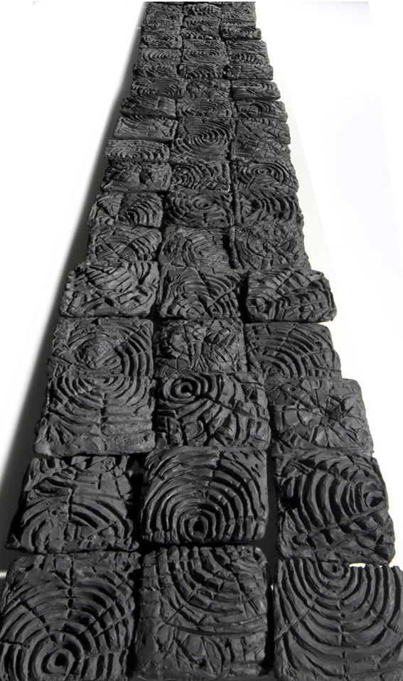 “Nell'esposizione ‘Seasons’ presento alcuni cicli di opere, accostandoli più che per tecnica e materiali, per analogia poetica. Ho immaginato lo spazio della galleria come un rettangolo di luce e ombre, con due campi laterali idealmente opposti: da un lato, sculture bianche proposte come momenti di luce, saggezza o tabula rasa; dall'altro, Gomme nere e costruzioni con terra, che vivono d'ombra e appartengono alla parte più noir del mio inconscio. Al centro ho ricercato l'equilibrio delle parti, così come la loro compenetrazione, sospendendo una piccola e magica scultura sferica in ceramica, Vuoto celeste, ed alle sue spalle un' immagine fotografica della stessa, di grandi dimensioni. L'installazione a terra Orme, composta da gomme assemblate, traccia una linea nera come ad indicare una sorta di percorso terreno dell'esistenza con i punti di fuga e di unione; è un lavoro in fieri che considero infinito, perché aggiungo negli anni altri moduli e li accosto in maniera differente, modificandone la composizione. Alle Orme si contrappone un'opera sospesa, Discus: una costruzione bianca concepita dall'aggregazione di micro-sculture circolari e ovoidali, che disegnano il vuoto, proiettandolo sul muro. Le opere d'arte non hanno stagioni ma hanno da sempre accompagnato le stagioni della mia vita.” (Luisa Elia)