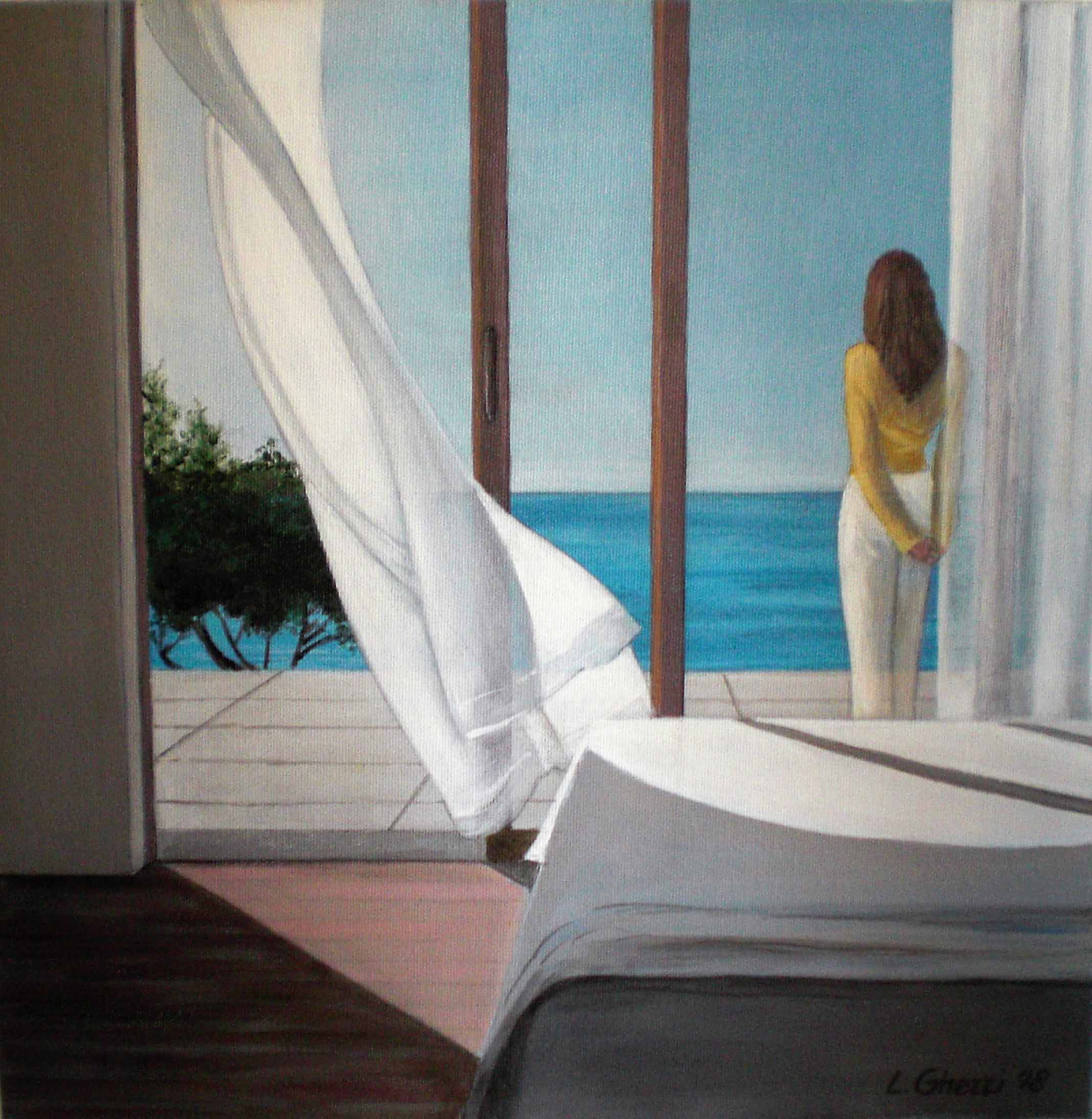 Una serie di interni, stanze vuote e luminose che si affacciano su scorci di cielo, oppure abitate da una sola presenza femminile silente e assorta. E è proprio il silenzio che regna sovrano. Il silenzio e il vento che muove le tende. Un silenzio assorto assorto e carico di un senso sereno di attesa