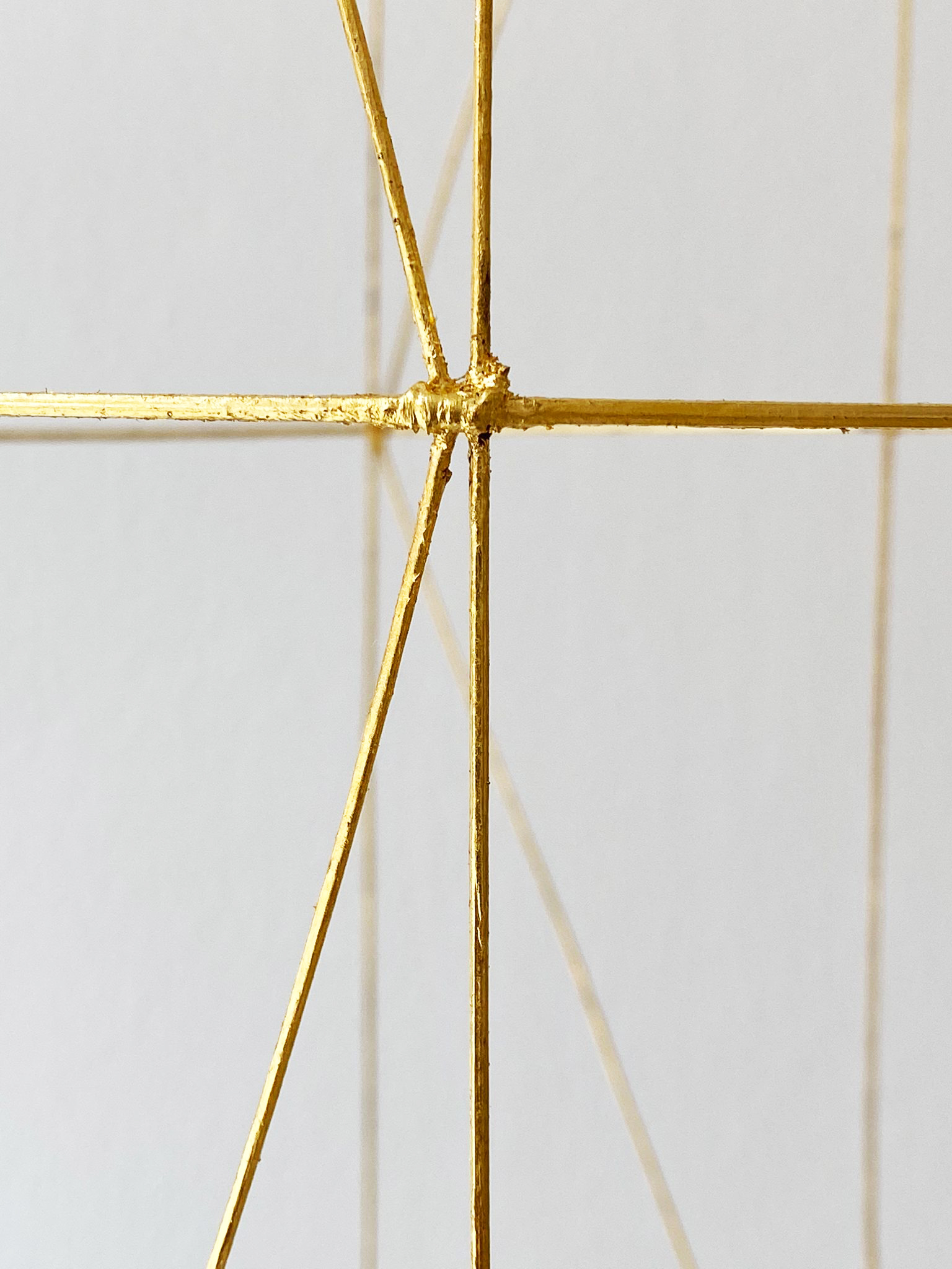 La capacità di reazione a spazi specifici è un elemento che si ritrova profondamente anche nel lavoro di Jain che, nella sua pratica, ricerca nuovi modi per trasformare i materiali in forme nello spazio. Il risultato si può vedere nei volumi dalle proporzioni squisitamente realizzate, che vengono attraversati in continuazione dall’atmosfera. Jain ha fondato il suo Studio Mumbai nel 2005 con l’obiettivo di esplorare diverse possibilità, superando i limiti linguistici, geografici, culturali. Per la mostra presso ALMA ZEVI, Jain si è ispirato a Venezia integrando la foglia d’oro nel suo lavoro, applicata a strutture architettoniche che appaiono come totem fatti di bambù e filo. Questi volumi invitano i visitatori a osservarli da tutti i lati, per scoprire gravità, massa, peso, volume, luce e aria.