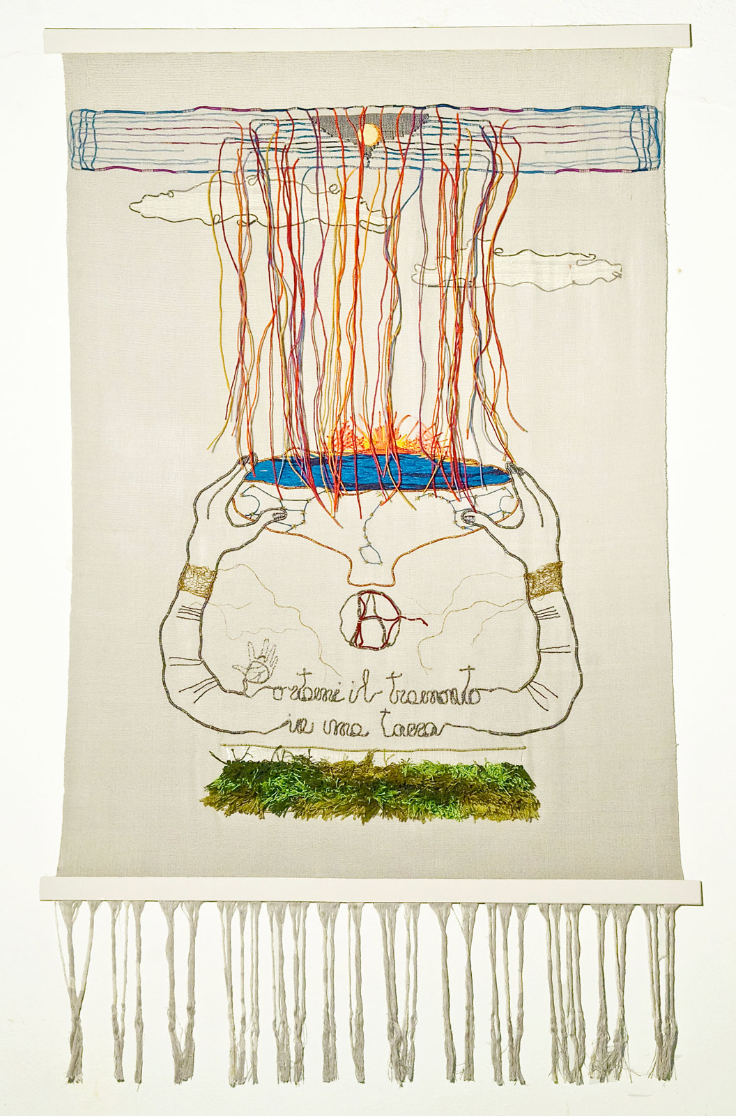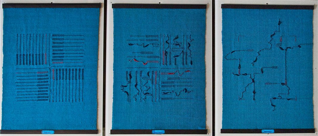 In mostra una selezione di arazzi eseguiti dal 1980 a oggi con la tecnica della tessitura a due licci, arricchiti, nel corso del processo tessile, da tecniche miste.