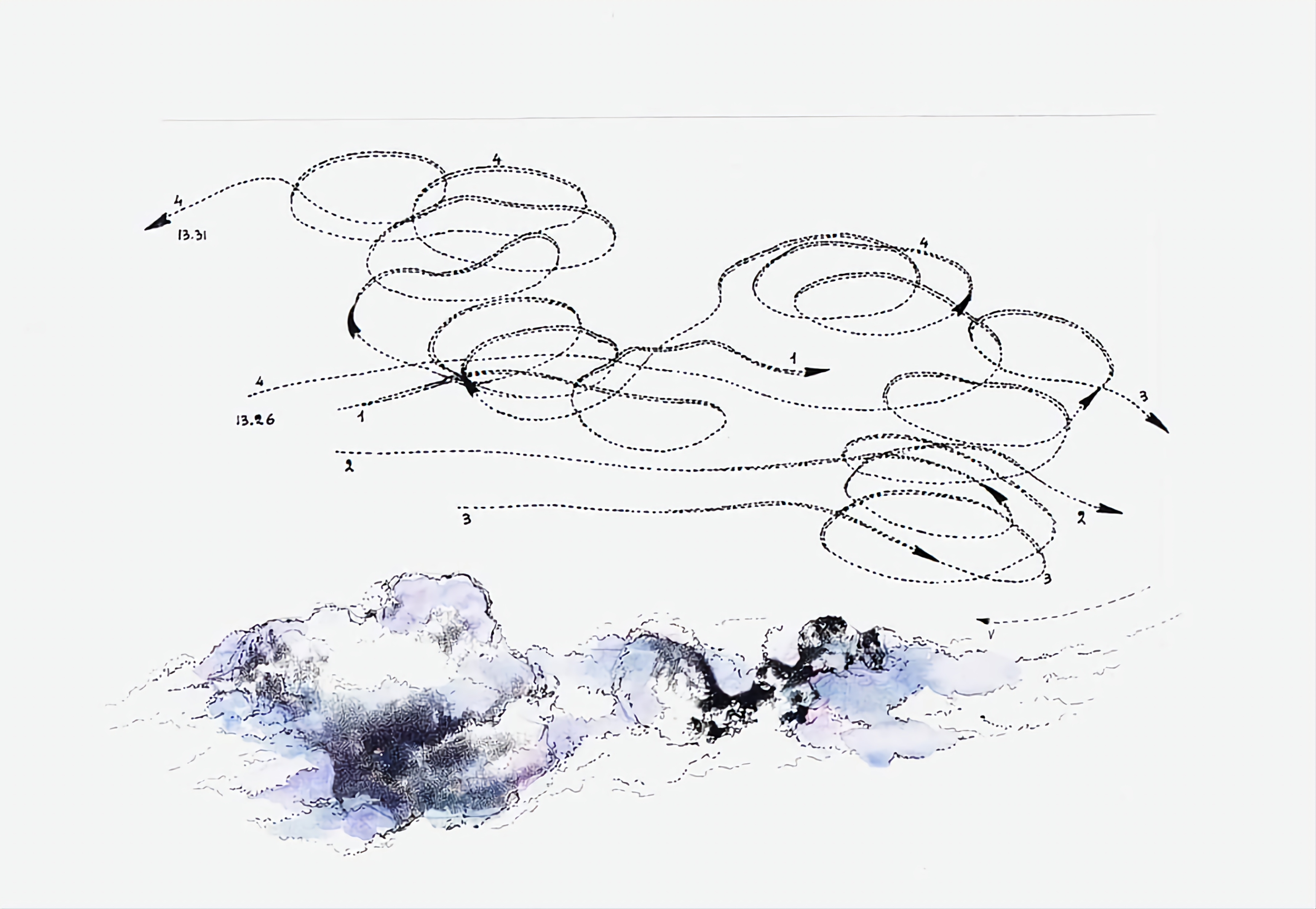 Nascono così opere con infiniti segni, tracciati funambolici e iterati che riproducono le traiettorie il volo degli uccelli osservato per oltre quarant’anni. Circonvoluzioni che sembrano disegnare un possibile percorso della libertà, della felicità. L’impressione soave, ma netta è quella del manifestarsi di un segreto: dare forma, rendere visibile qualcosa che di per sé è effimero, inafferrabile rende concreta un’aspirazione interiore di partecipare a quelle evoluzioni. La simbologia del volo è sempre legata all’idea di libertà, di innalzamento dell’anima, di ascesi verso la verità suprema, esprime il desiderio di sublimazione e la ricerca di un’armonia interiore.