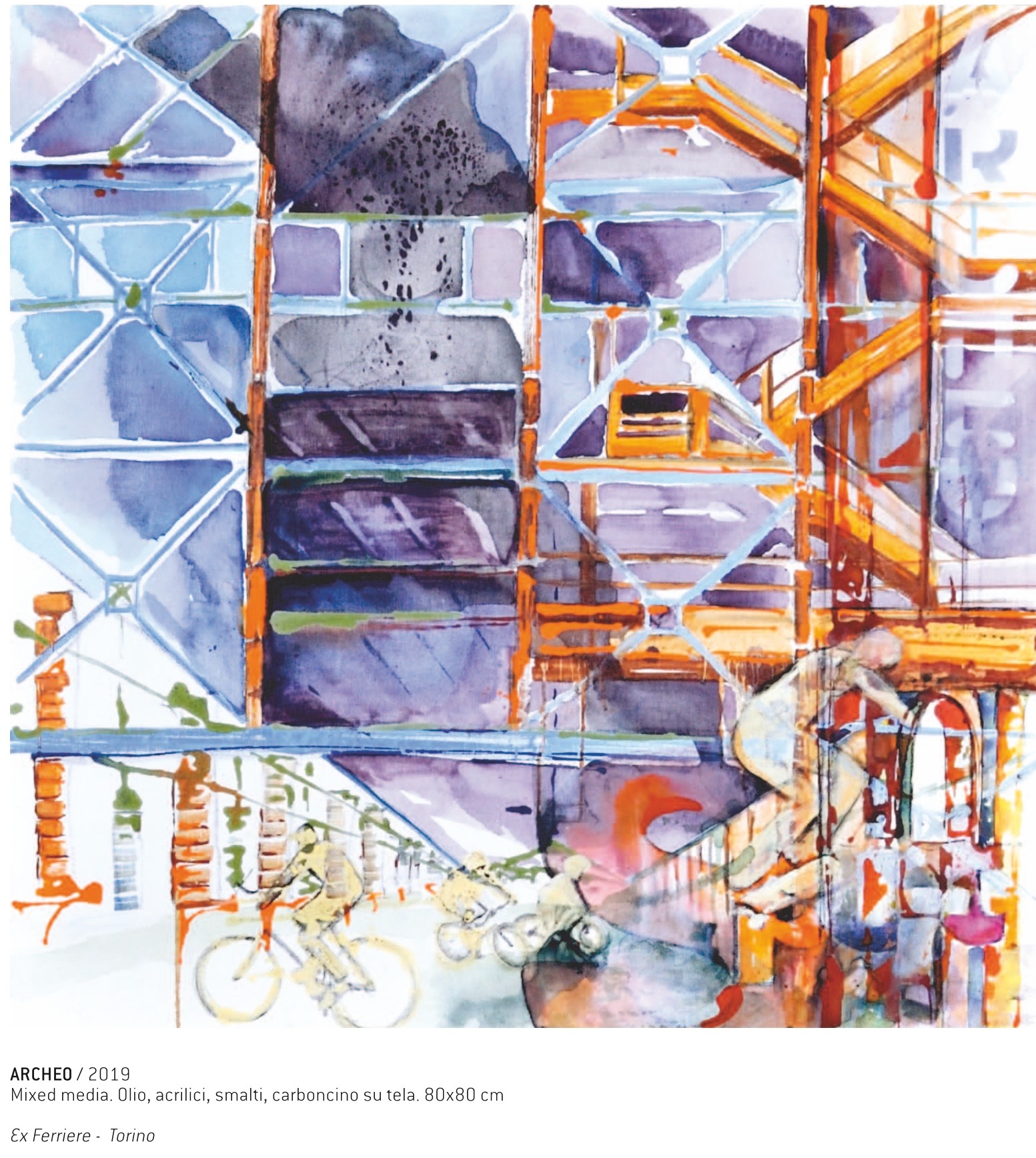 Il palindromo ne è il veicolo identificato in un doppio filone: nei titoli, parte integrante delle opere, e in alcune tele installative bifacciali. Torino, rivisitata in angolazioni molteplici, diviene invece lo sfondo sul quale l’artista dipana il suo tema che sfoca confini e apre orizzonti.
