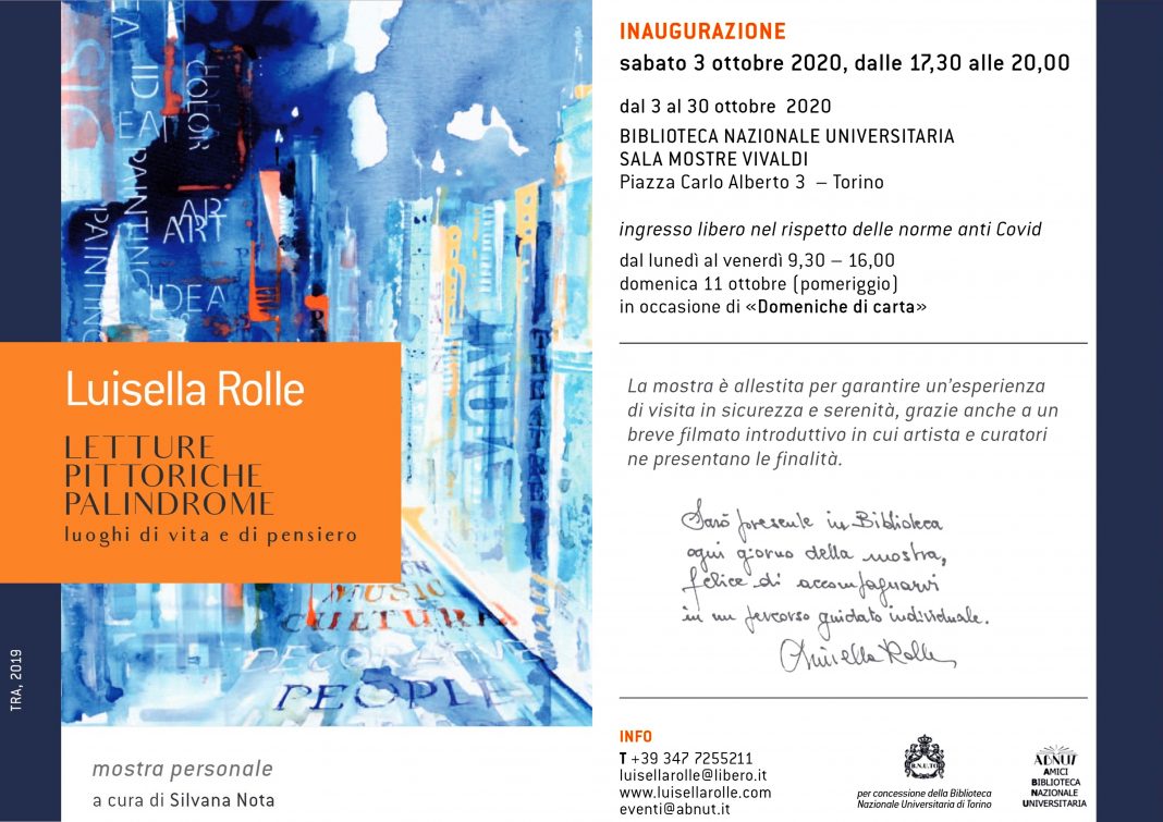 Sabato 3 ottobre alle ore 17,30 si inaugura, presso la Biblioteca Nazionale Universitaria di Torino, la personale dell’artista Luisella Rolle, che presenta in questa occasione una mostra frutto di un progetto sviluppato in molti anni intorno al mondo urbano percepito attraverso lo spostamento del punto di vista.