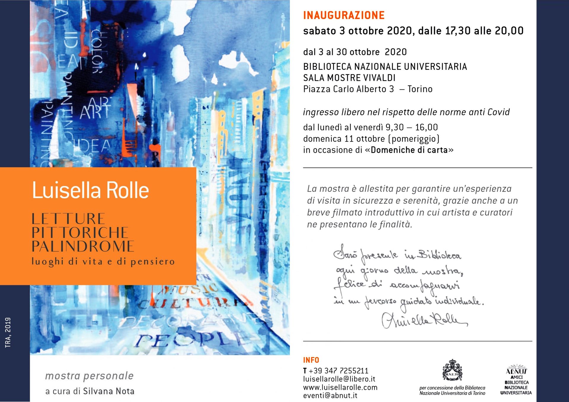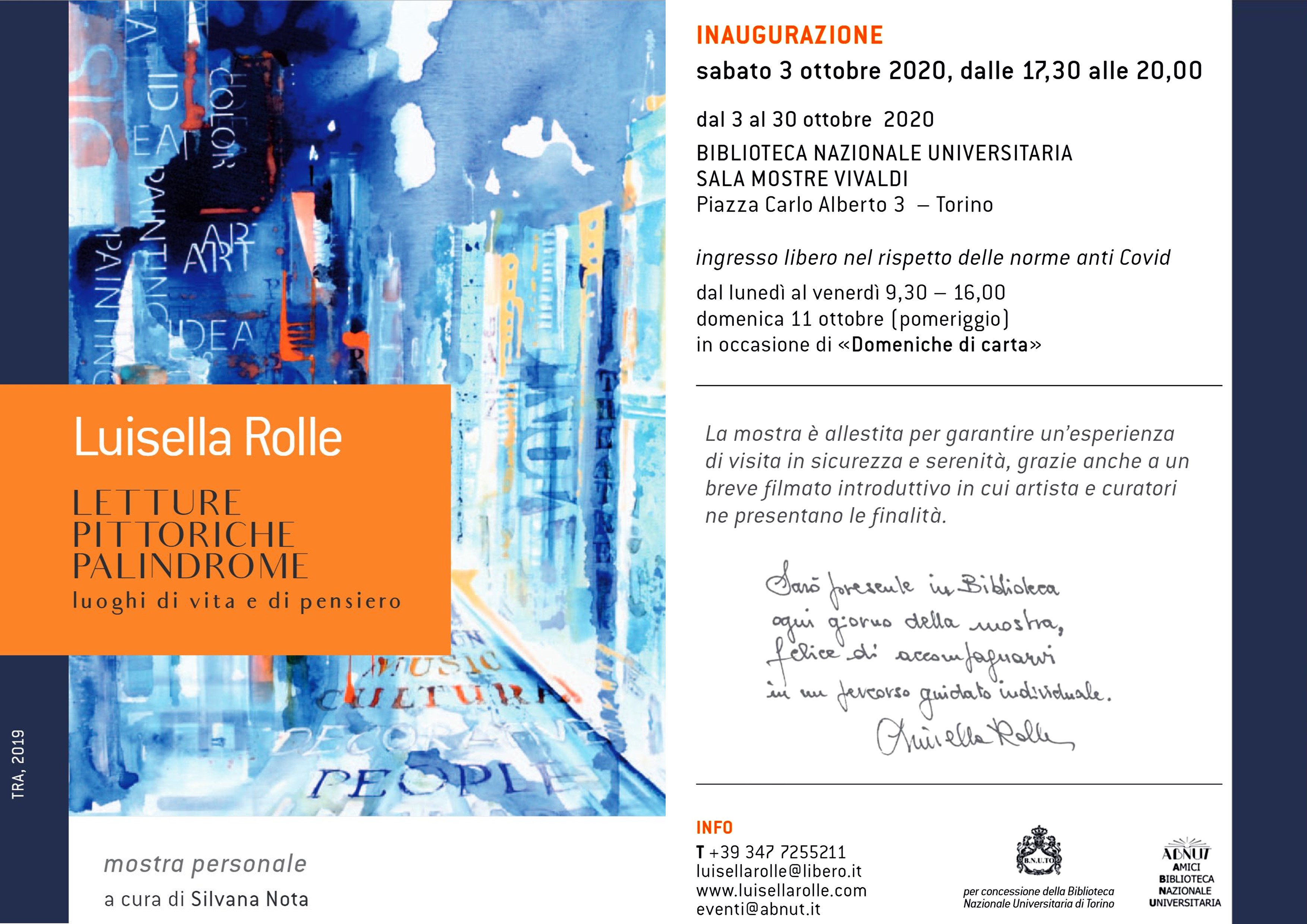 Visitabile dal lunedì al venerdì dalle 09.30 alle 16.00, dal 5 al 30 ottobre presso la Sala Mostre della Biblioteca Nazionale Universitaria di Torino.