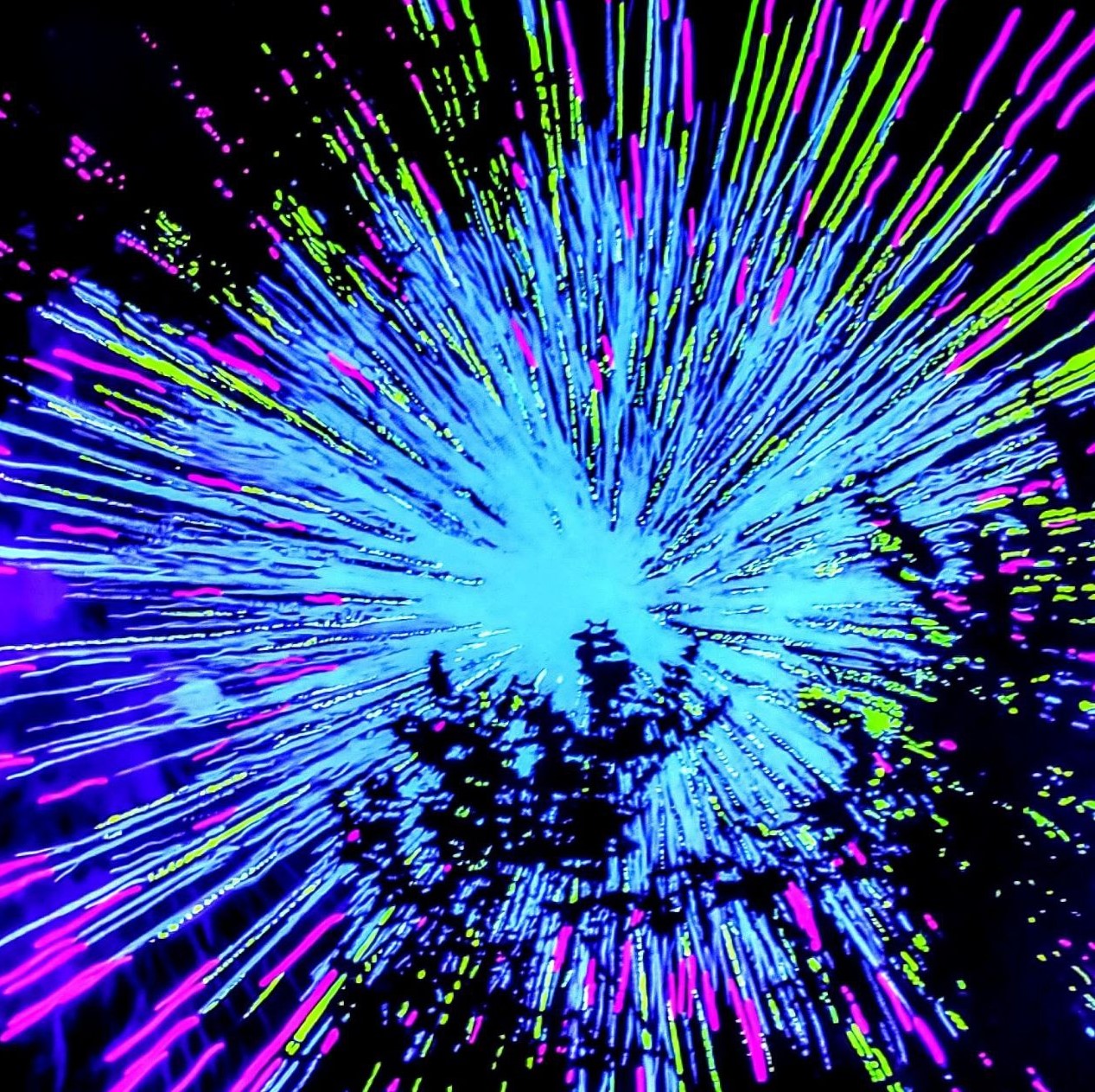 La tematica dei fuochi d'artificio è al centro dell'opera di Ruggieri, che utilizza la luce per riprodurre l'effetto cromatico e luminoso tipico di questi spettacolari giochi pirotecnici. L'artista sperimenta con la fotografia e la pittura luminescente, dando vita a forme colorate e dinamiche, che evocano il senso di movimento e di trascendenza.