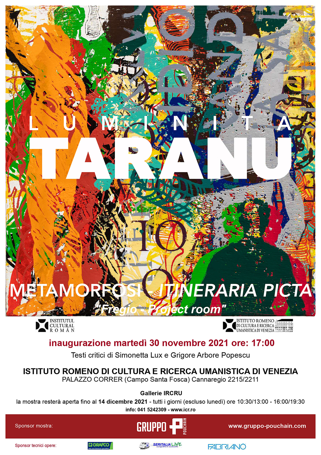 L’Istituto Romeno di Cultura e Ricerca Umanistica di Venezia, nella persona del Direttore Prof. Grigore Arbore Popescu presenta la mostra personale di arti visive “METAMORFOSI - ITINERARIA PICTA. Fregio - Project room” dell’artista Luminita Taranu, visitabile dal 30 novembre al 14 dicembre 2021 nella Galleria IRCRU e nella Nuova Galleria dell’Istituto.