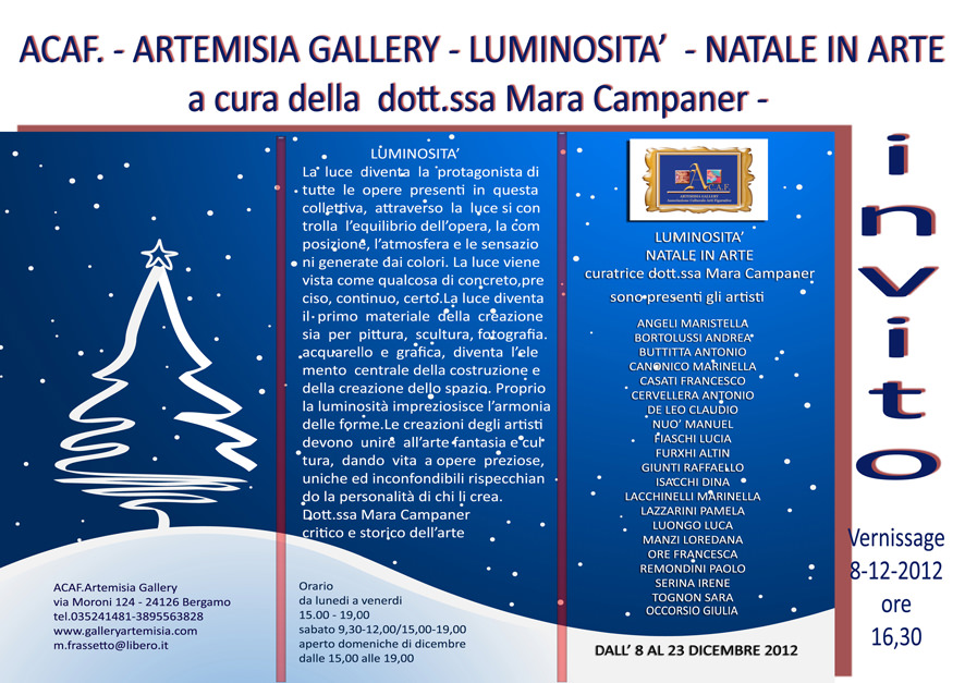Nel locale dell’Associazione ACAF-Artemisia Gallery dal 8 al 23 dicembre si tiene la collettiva d’arte curata dalla dott.ssa Mara Campaner – tema della collettiva “LUMINOSITA”