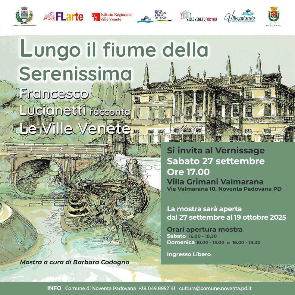 Dal 28 settembre al 19 ottobre 2025, con inaugurazione sabato 27 settembre alle ore 17.00, Villa Grimani Valmarana a Noventa Padovana ospita la mostra “Lungo il fiume della Serenissima: Francesco Lucianetti racconta le Ville Venete”, a cura di Barbara Codogno e promossa da FLarte