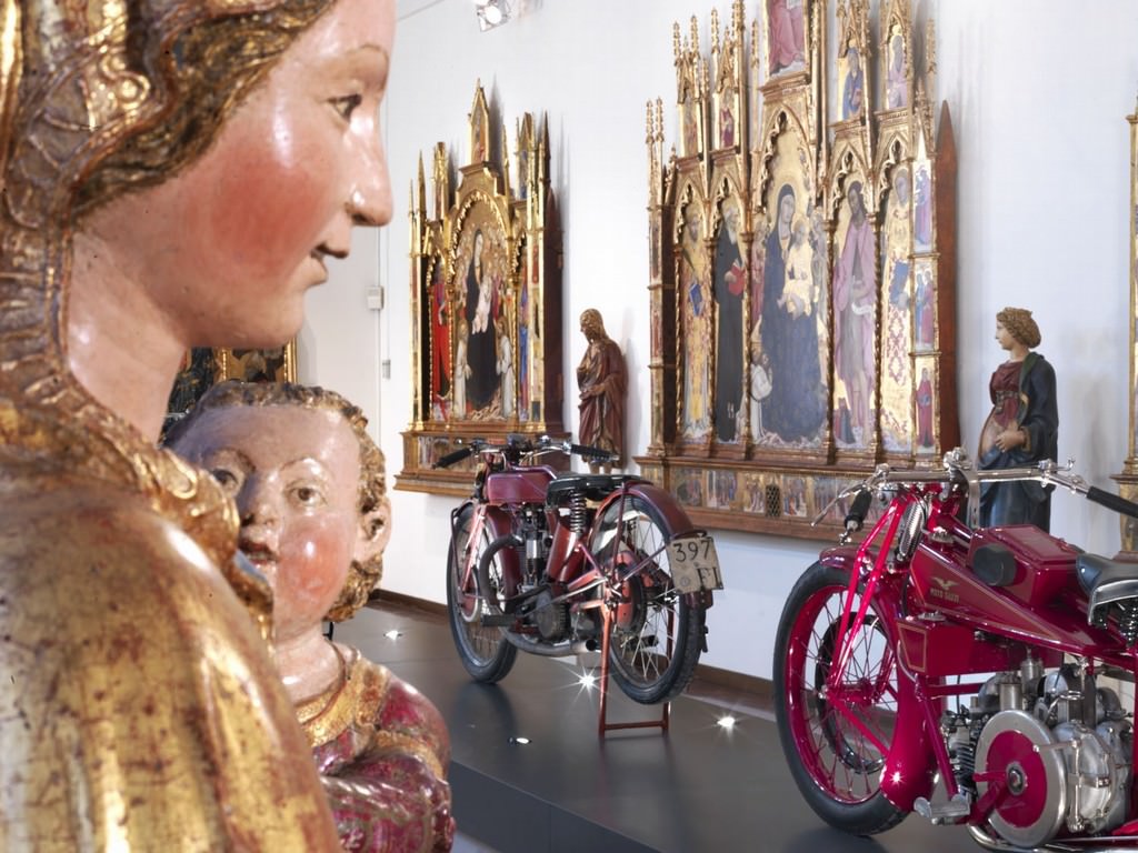 Intesa come una articolata e congegnata invenzione figurativa o anche più semplicemente come oggetto artistico in cui il telaio diventa vera e propria costruzione architettonica e linguaggio formale, la macchina rivive negli straordinari capolavori dei maestri senesi eccezionalmente accostati alle macchine a motore e alla macchina umana. Automobili e motocicli degli anni futuristi compresi tra il 1909 e il 1930, trovano posto nelle prestigiose sale dei trecenteschi e quattrocenteschi dipinti a fondo oro, mentre alcuni modelli anatomici dei primi decenni del ‘900, in gesso o cera utilizzati a scopo didattico, vengono allestiti in contrasto con opere pittoriche di straordinaria complessità compositiva, dove l’anatomia nell’uso esasperato del movimento dei corpi e della tensione energetica (Beccafumi), assume invece il significato di macchina espressiva.