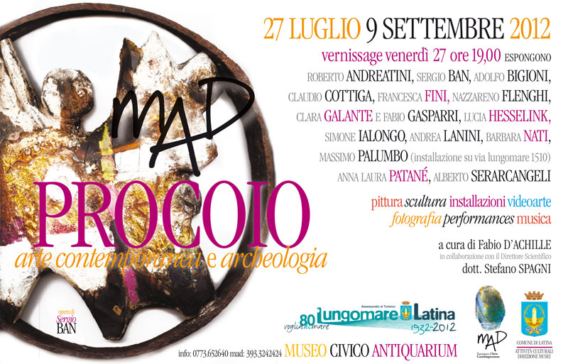 Anche quest’anno MAD Rassegna d’Arte Contemporanea propone MAD Procoio, collettiva di artisti contemporanei che si confrontano con l’archeologia e con opere ispirate ai temi del mare in un contesto storico come quello del Museo Antiquarium perché arte e storia insieme creino emozioni e per creare un’identità fatta di ambiente, arte e territorio in un location storico-culturale. Pittura, scultura, performances, videoarte, installazioni, musica e fotografia entreranno in contatto tra di loro: l’intento che anima l’iniziativa è quello di coinvolgere tutte le forme di espressione artistica in un dialogo e in un confronto che sia costruttivo per gli artisti così come per il pubblico. Esporranno: Roberto Andreatini (scultura); Sergio Ban (scultura); Adolfo Bigioni (pittura); Claudio Cottiga (scultura installazione); Francesca Fini (video arte); Nazzareno Flenghi (installazione); Clara Galante e Fabio Gasparri (installazione fotografica e intervento poetico); Lucia Hesselink (scultura installazione); Simone Ialongo (pittura) Andrea Lanini (scultura installazione); Barbara Nati (fotografia); Annalaura Patanè (pittura); Alberto Serarcangeli (incisione). L’evento sarà presentato dal curatore di MAD Fabio D’Achille, dalla dott.ssa Marcella Cossu, direttrice della Raccolta Manzù di Ardea, Stefano Spagni Direttore Scientifico dell’Antiquarium Civico del Procoio, da Giovanni Papi, Cristiano Spiti e Laura Cianfarani.