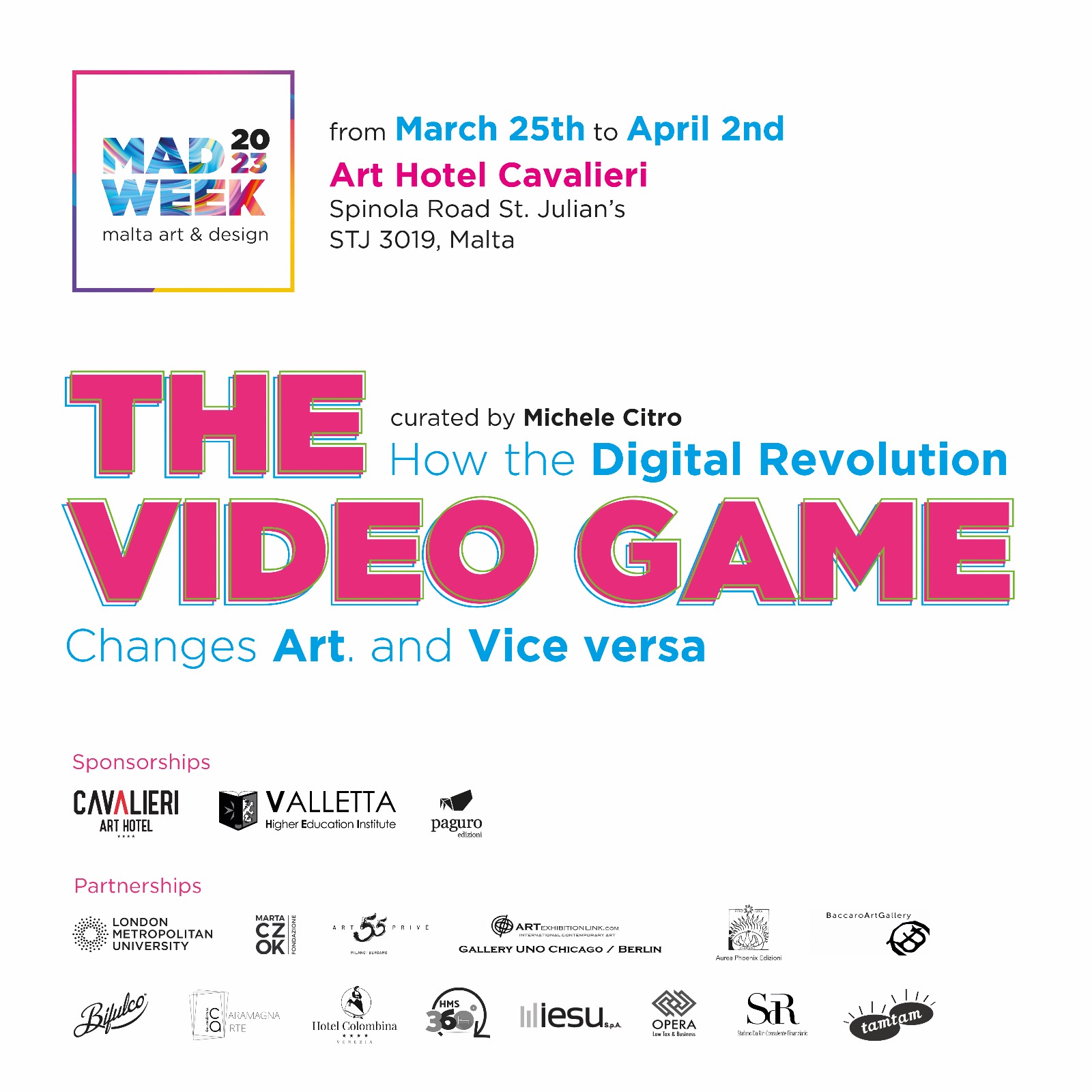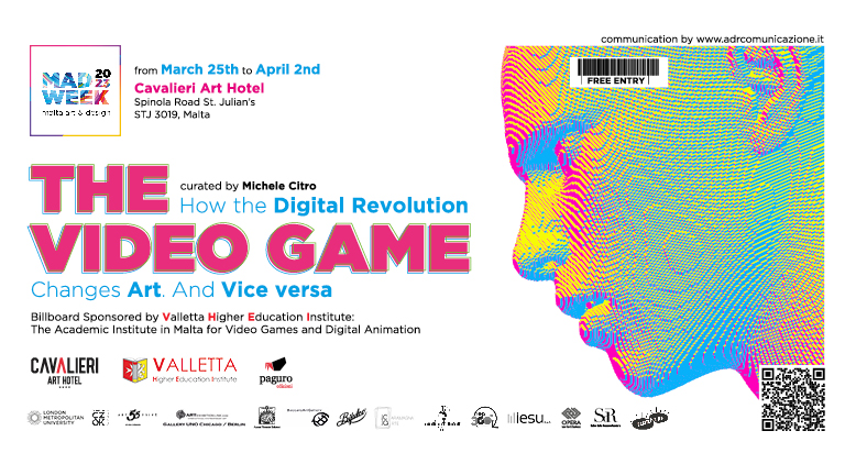 Dal 25 Marzo a 2 Aprile 2023 si terrà nella splendida cornice del Cavalieri Art Hotel di St. Julian’s, a Malta, la prima edizione della MAD WEEK. La Settimana dell'Arte e del Design di Malta — ideata ed organizzata dal curatore campano Michele Citro (Biennale del Gattopardo, Loci Interdicti, Tra Inferno e Paradiso ecc.) in sinergia con il management del Cavalieri ed il Valletta Higher Education Institute, realtà universitaria dedita al mondo dei videogiochi e dei cartoni animati diretta dal mitico Padre Joystick, Don Patrizio Coppola — avrà come tema «THE VIDEO GAME. Come la Rivoluzione Digitale cambia l'Arte. E Viceversa». Ventinove le ricerche selezionate e proposte da artisti italiani e stranieri attraverso 81 opere, fra quadri, sculture ed installazioni, che riflettono ed invitano a riflettere e a pensare sulle influenze del progresso digitale sulla cosiddetta “arte tradizionale”. Una mostra "non digitale" ma che ri-sente del digitale e di come quest'ultimo abbia determinato una trasformazione — conscia, ma spesso anche inconscia — sul modo di percepire le immagini, con-cepirle, ricomporle, metabolizzarle, interpretarle e, infine, restituirle. Il risultato: un esperimento psico-socio-antropologico e, naturalmente, artistico di cultura visuale o visiva avvalorato, anche, dai contributi saggistici di una serie di stimati accademici e professionisti quali Anna Bassi e Francesco Toniolo, Adele Fraracci, Andrea Guastella, Alessandro Guerriero e Giacomo D. Ghidelli, Gianluca Iaione, Guido Mastroianni, Giuseppe Simone Modeo e Jacek Ludwig Scarso.