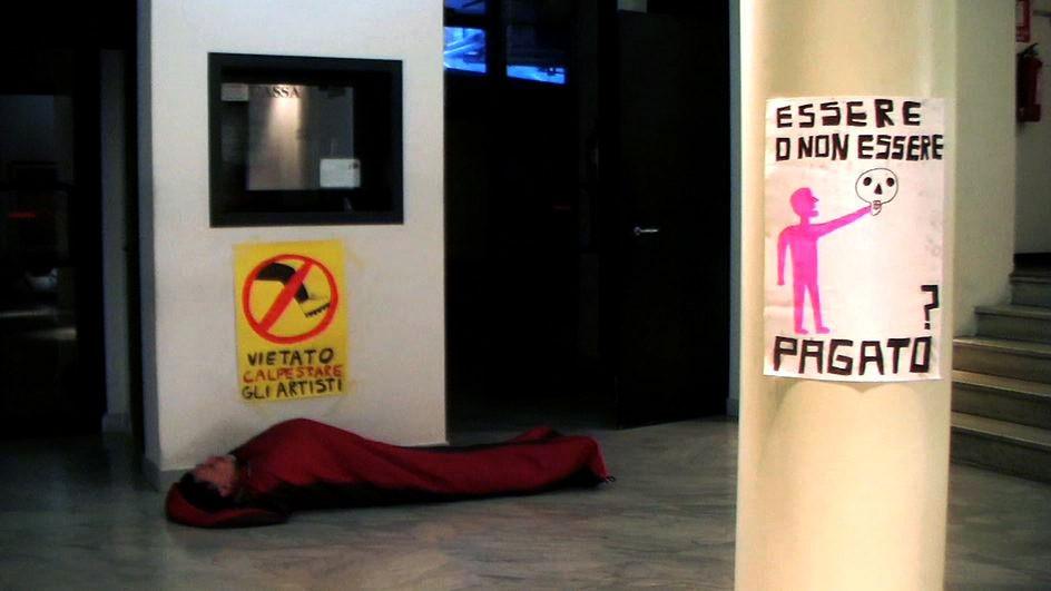 Vietato calpestare l'artista consiste in una performance-installazione audio-video che mette in scena il tema della progressiva erosione dei diritti degli artisti quali lavoratori: pur se riconosciuti dal sistema dell'arte e dalla comunità artistica di riferimento, essi non riescono a mantenersi attraverso il proprio lavoro, dovendo ricorrere a impieghi collaterali a sostegno della pratica artistica. La sfera politica e quella economica manifestano interesse nei confronti del loro operato senza però considerarli come interlocutori sociali. La performance Vietato calpestare l'artista, che avrà luogo lunedì 11 luglio alle ore 19 e alle ore 21, consiste in un'installazione audio e video gestita dal vivo da Maddalena Fragnito e Emanuele Braga; nei giorni seguenti sarà possibile fruire dell'installazione attraverso i contributi audio scaturiti dalla performance.