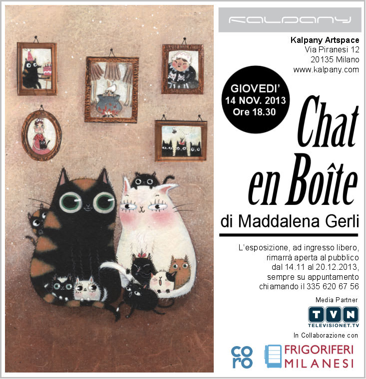 Chat en Boîte è il titolo della sua ultima personale, una sorta d’excursus che dai suoi esordi ci accompagna, con uno stile leggero e divertente, fino alle sue opere più recenti, alcune appositamente realizzate per l’occasione. Una mostra che vuole essere una vera e propria festa - tra cappellini, trombette e coriandoli - per dei festeggiati speciali: i gatti! Da sempre i gatti affascinano Maddalena, per la loro sensibile intelligenza e il loro indiscusso mistero. L’autrice ha infatti innumerevoli volte incrociato il cammino di questo felino, illustrando storie per ogni tipo di gatto; storie per Gatti coccolati e viziati, come nel “Le chat de la mère Michel”, nota fiaba di Emile De La Bedollière, (éditions Mouck ); storie per felini umanizzati con SOTTOpiedi nelle scarpe per i piedi puzzolenti, come nel libro “Sottosopra” scritto da Cristina Bellemo (edizione Zoolibri); e ancora storie per gatti grandi e terribili, come nel racconto della scrittrice portoghese Rita Vilela “Corso di coraggio per bambini paurosi” (Edizioni san paolo – Langue&parole).