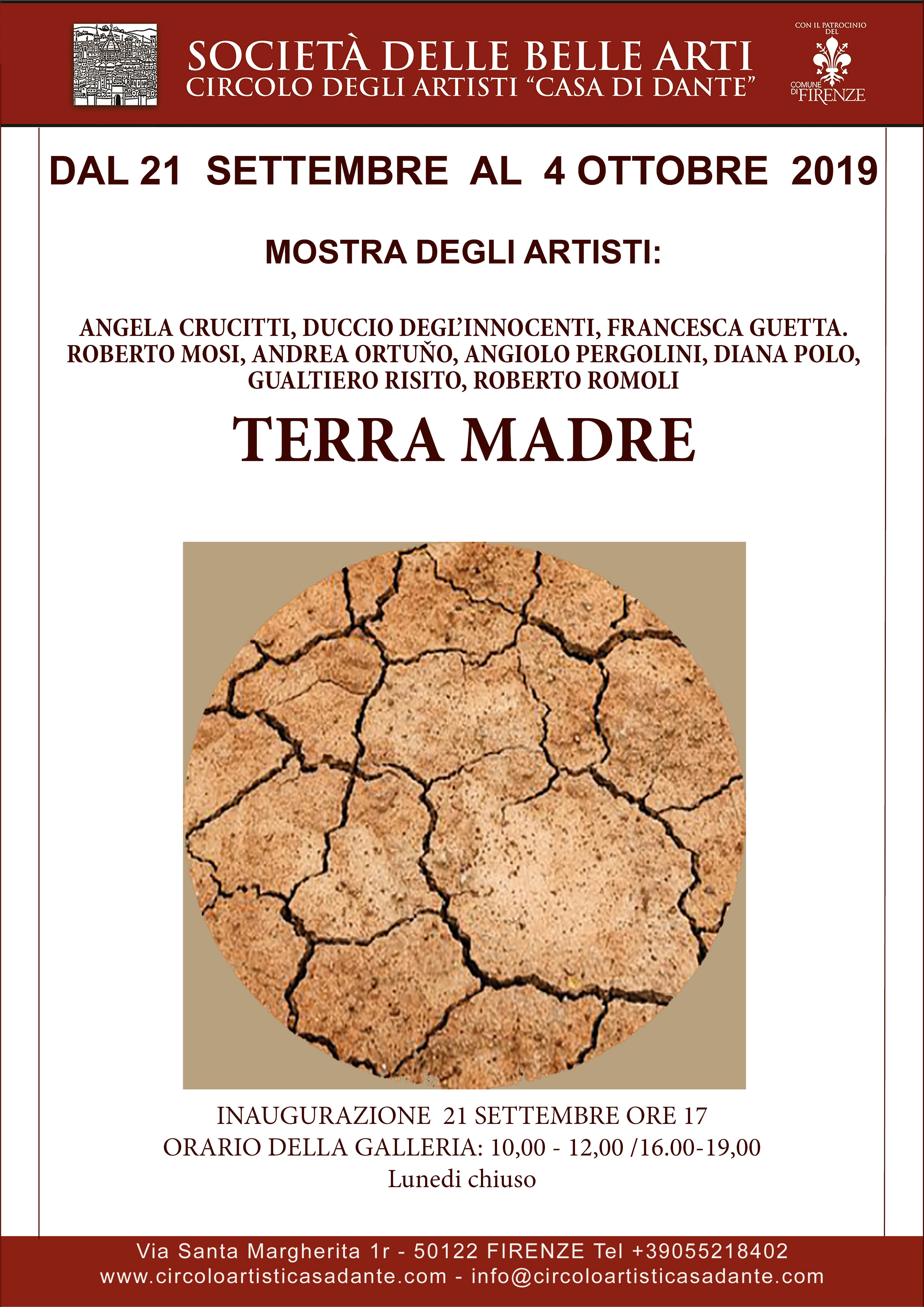 Alle ore 17.00 di Sabato 21 Setembre si inaugura presso la galleria della Società delle Belle Arti Circolo degli Artisti Casa di Dante in Via S.Margherita 1r Firenze la Collettiva "MADRE TERRA" nove Artisti con altrettanti punti di vista, nove sguardi e relative considerazioni sul pianeta che ci ospita e che senz'altro dovremmo trattare meglio