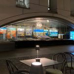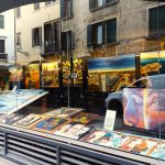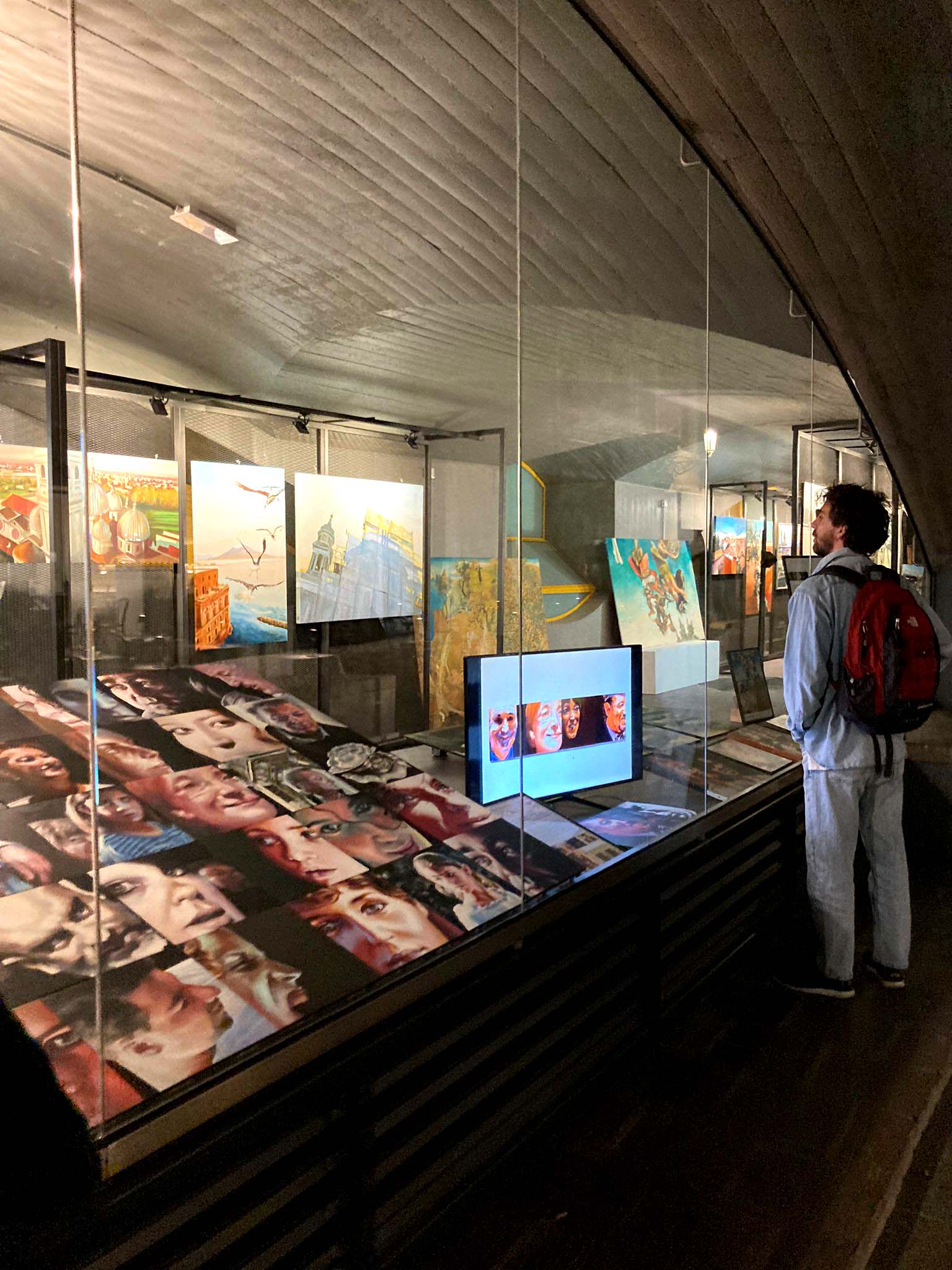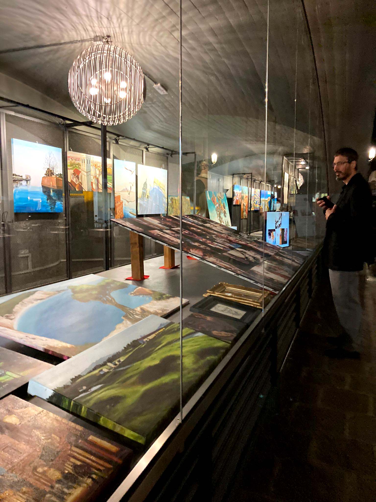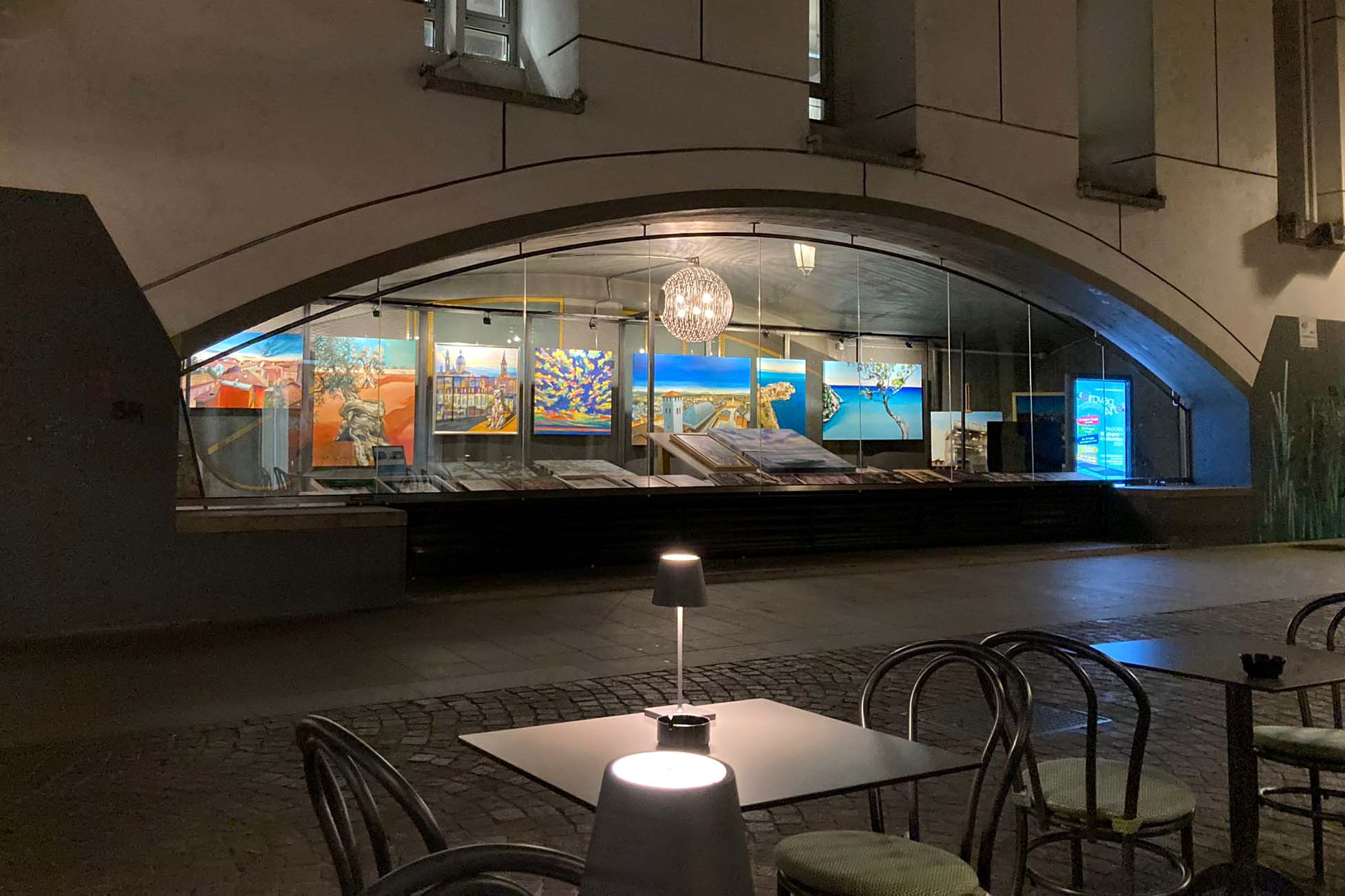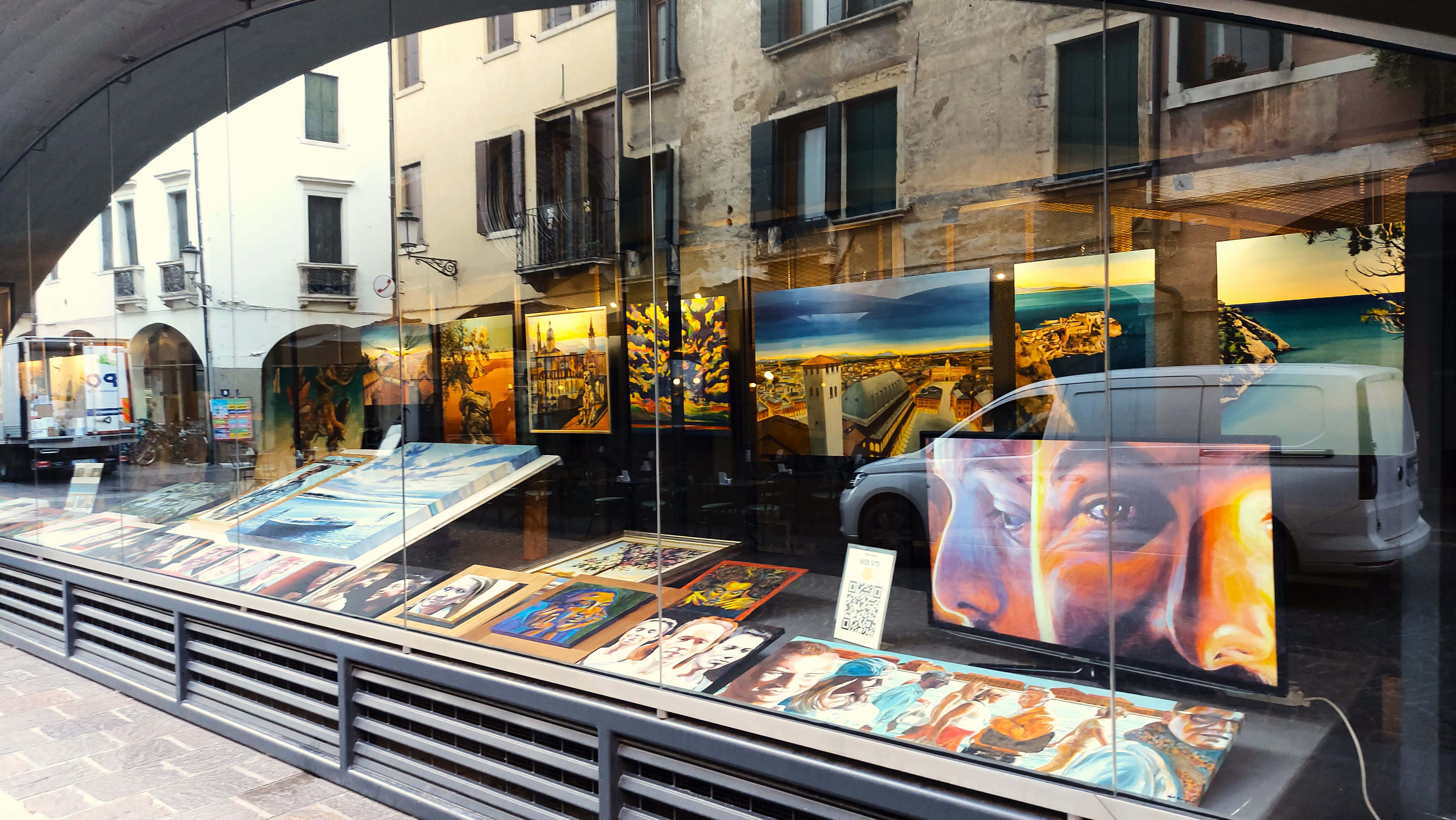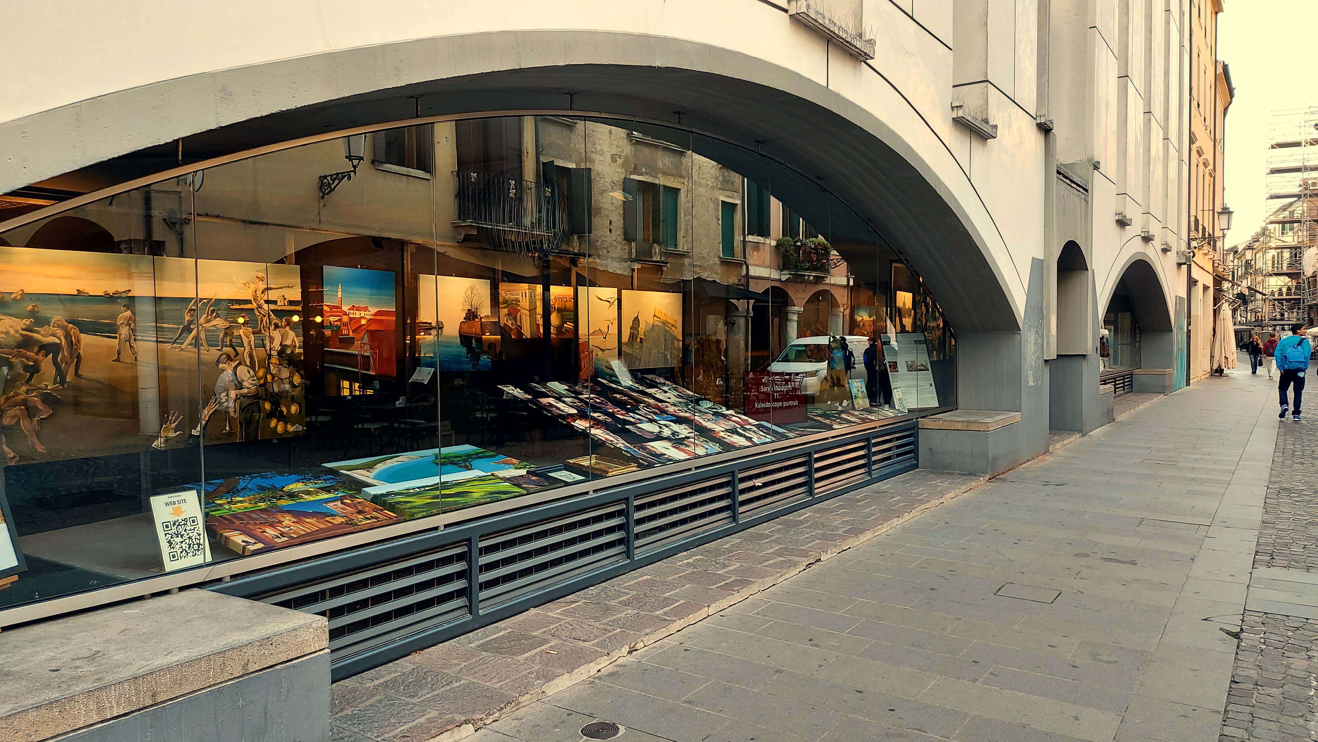 La tensione delle opere dietro la vetrina si trasporta all'esterno, creando una zona di passaggio tra il dentro e il fuori, sia fisica che simbolica.