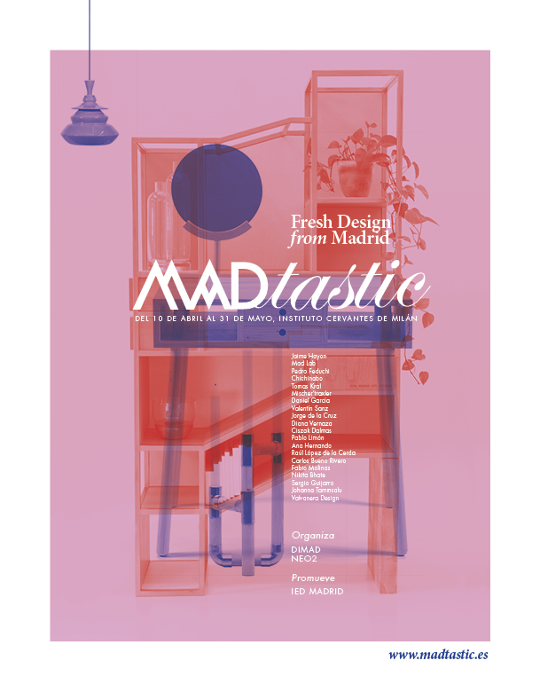 Il prossimo 10 aprile, la rivista madrilena di tendenze Neo2, in collaborazione con l’associazione di designer della capitale spagnola - Dimad e l’Istituto Europeo di Design di Madrid presentano nella sede dell’Istituto Cervantes di Milano l’esposizione MADtastic! Fresh Design From Madrid, una mostra che vuole far conoscere editrici, disegnatori e le proposte più interessanti sorte recentemente nell’ambito del design contemporaneo della capitale spagnola.
