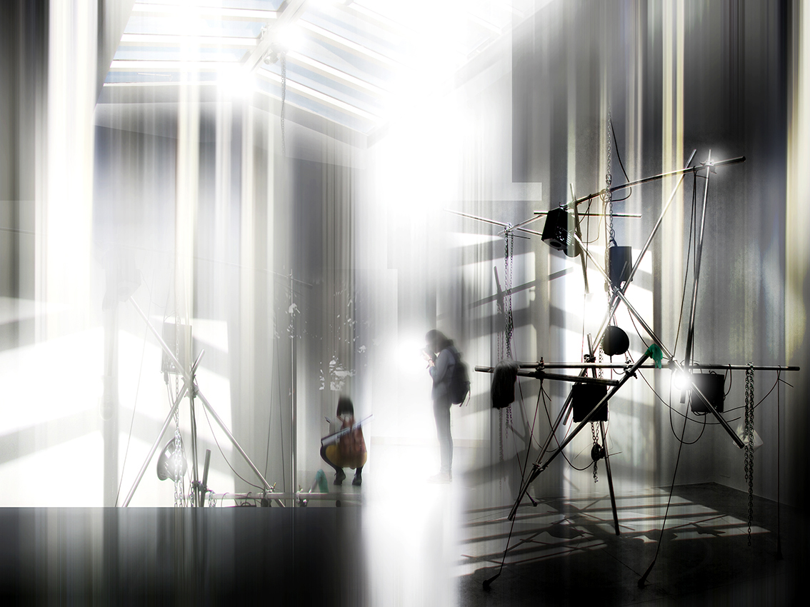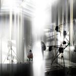 Le sculture, altra presenza importante all’interno delle opere, si alternano ad immagini dal grande impatto visivo dove tutto sembra evaporare, e le traiettorie di luce rivelano il disorientamento dell’uomo contemporaneo che tenta di instaurare un dialogo tra luoghi, spazi e tempi in una ricerca di un equilibrio costante tra staticità e movimento, realtà esteriore e introspezione, ordine e caos, razionale e irrazionale, materia naturale e tecnologia artificiale. Le sculture, ideate e realizzate dall’artista, ritornano, per essere guardate a 360 gradi, all’interno della mostra, tra incastri lineari ed elementi naturali (come il ricorrente bonsai) e nei disegni su carta in una nuova veste progettuale di studio.